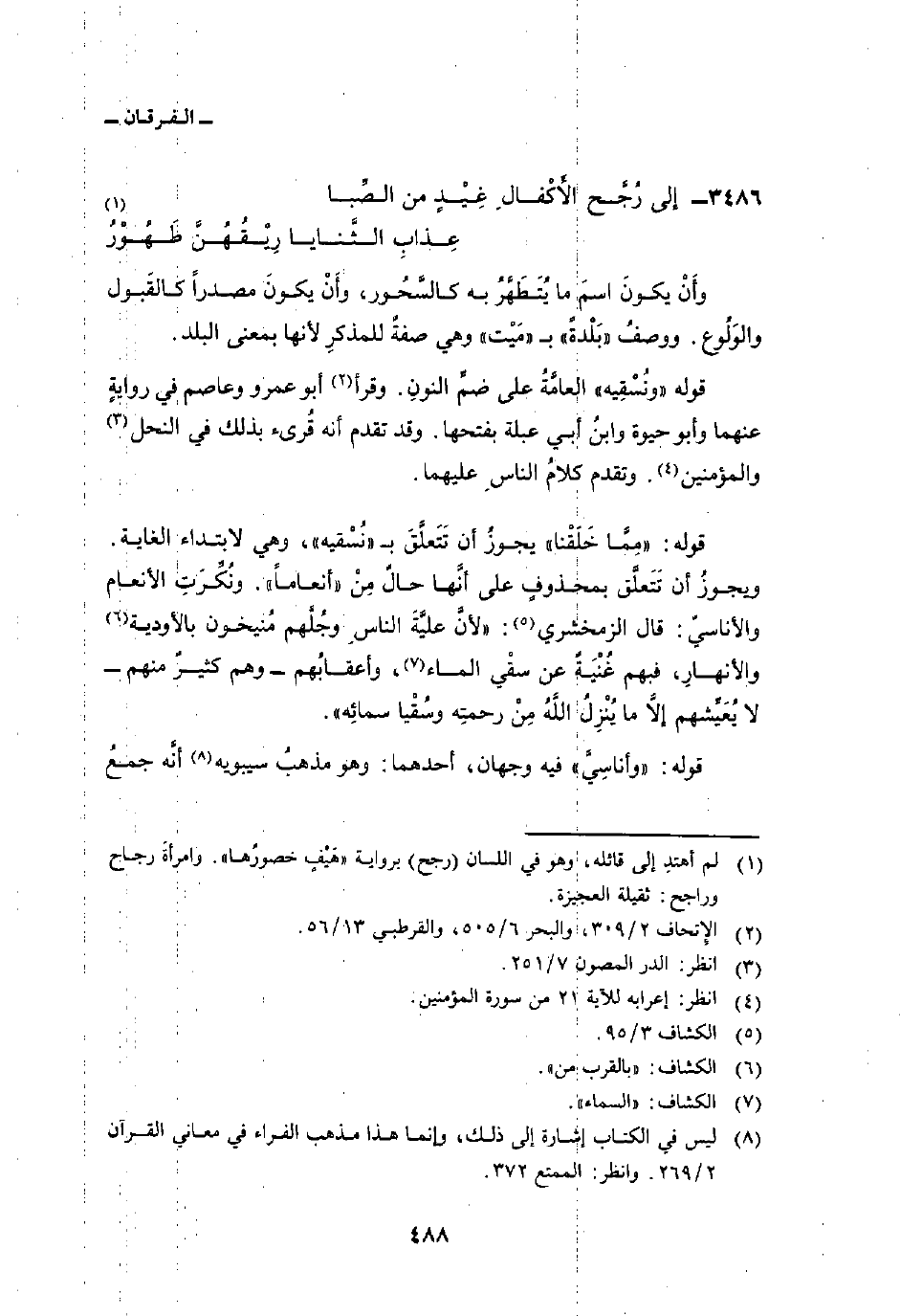 قوله: {مِمَّا خَلَقْنَآ} يجوز أن تَتَعلَّقَ ب «نُسْقيه» ، وهي لابتداء الغاية. ويجوزُ أن تَتَعلَّق بمحذوفٍ على أنَّها حالٌ مِنْ «أنعاماً» . ونُكِّرَتِ الأنعام والأناسيّ: قال الزمخشري: «لأنَّ عليَّةَ الناسِ وجُلَّهم مُنيخون بالأودية والأنهارِ، فبهم غُنْيَةٌ عن سقْي الماء، وأعقابُهم وهم كثيرٌ منهم لا يُعَيِّشهم إلاَّ ما يُنْزِلُ اللهُ مِنْ رحمتِه وسُقْيا سمائِه» .