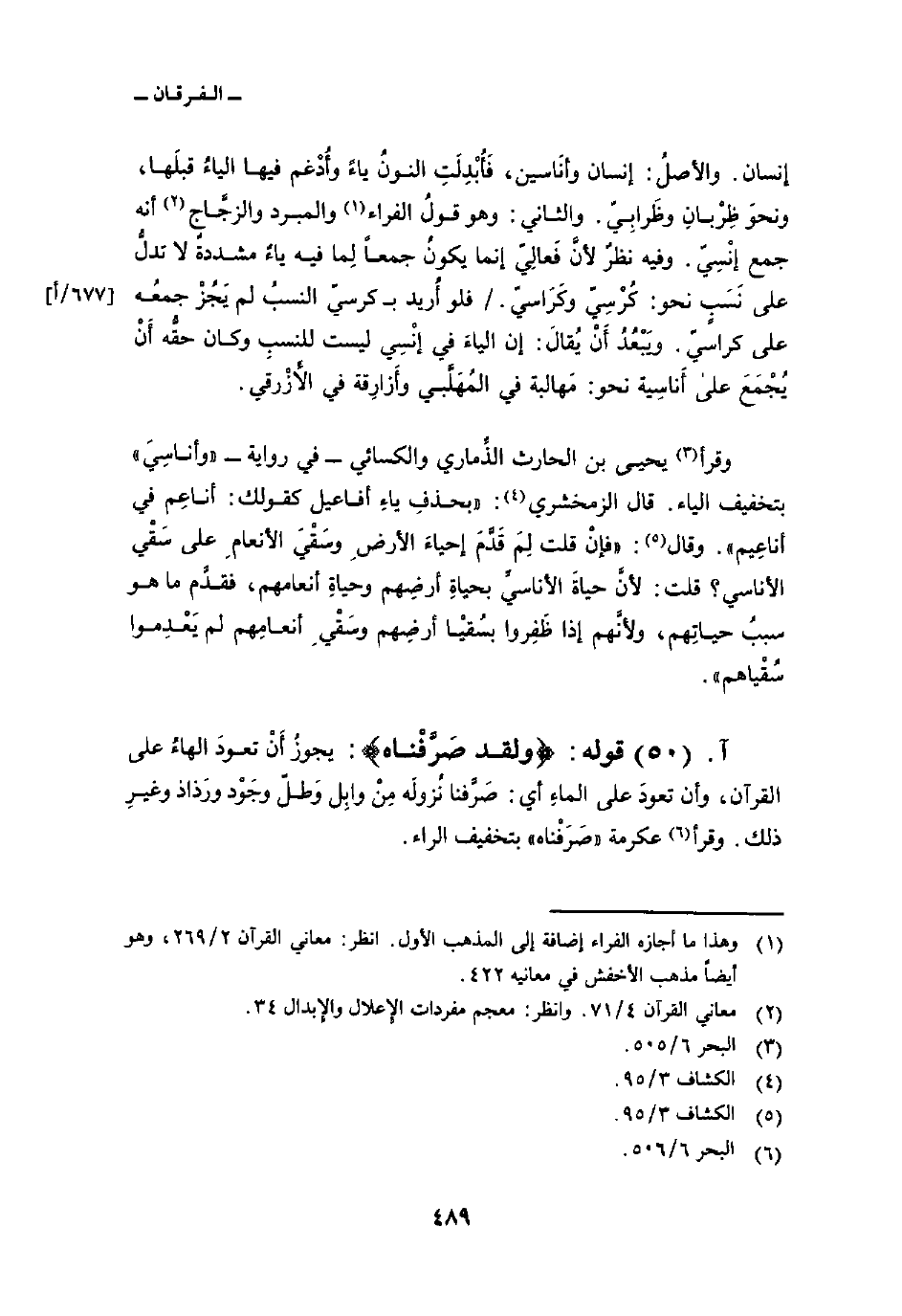 وقرأ يحيى بن الحارث الذِّماري والكسائي في رواية «وأناسِيَ» بتخفيف الياء. قال الزمخشري: «بحذفِ ياءِ أفاعيل كقولك: أناعِم في أناعِيم» . وقال: «فإنْ قلت لِمَ قَدَّمَ إحياءَ الأرضِ وسَقْيَ الأنعامِ على سَقْي الأناسي. قلت: لأن حياةَ الأناسيِّ بحياةِ أرضِهم وحياةِ أنعامهم، فقدَّم ما هو سببُ حياتِهم، ولأنَّهم إذا ظَفِروا بسُقيْا أرضِهم وسَقْيِ أنعامِهم لم يَعْدِموا سُقْياهم» .