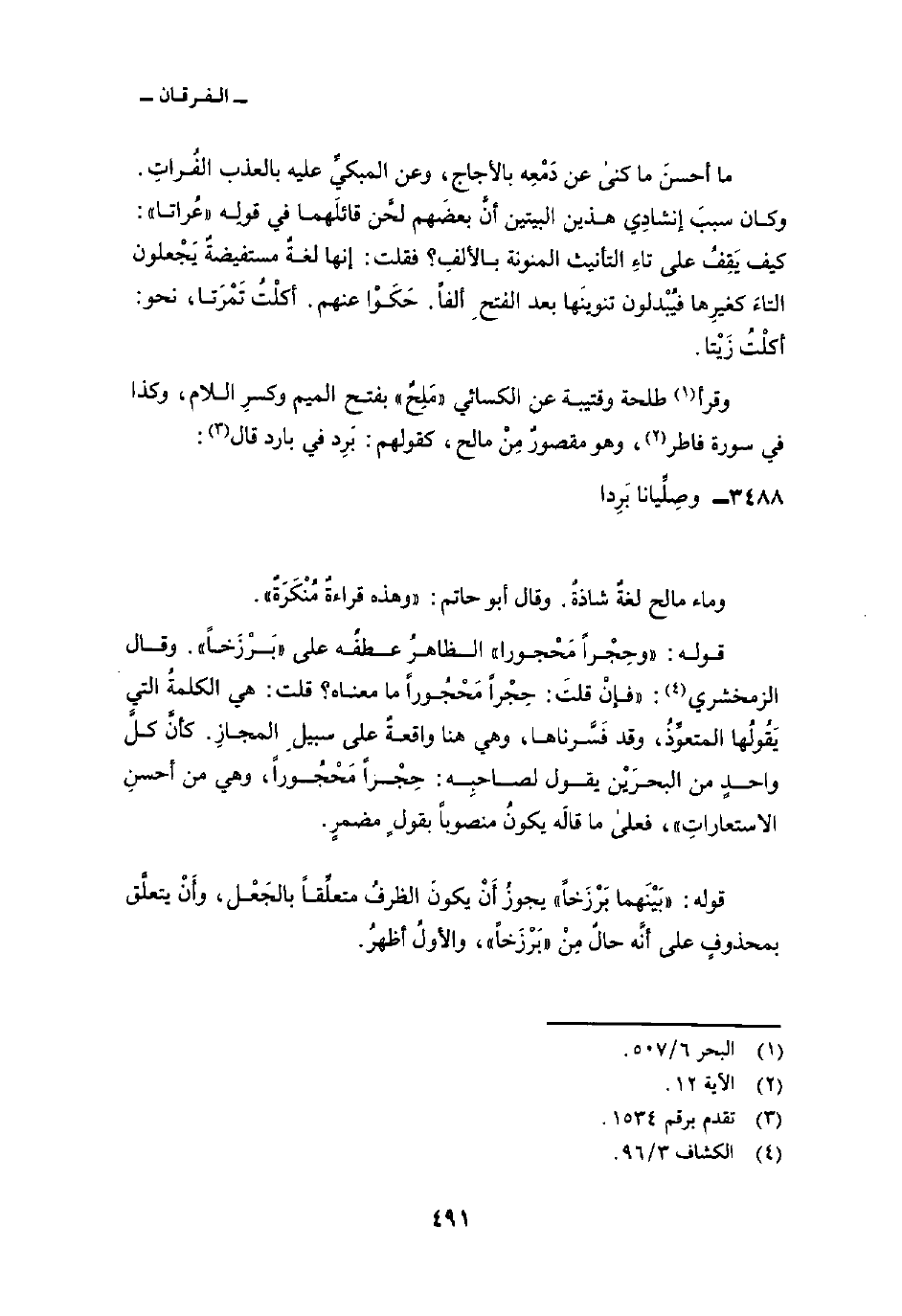 قوله: {وَحِجْراً مَّحْجُوراً} : الظاهرُ عطفُه على «بَرْزَخاً» . وقال الزمخشري: «فإنْ قلتَ: حِجراً مَحْجُوراً ما معناه؟ قلت: هي الكلمةُ التي يَقُولُها المتعوِّذُ، وقد فَسَّرناها، وهي هنا واقعةٌ على سبيلِ المجازِ. كأنَّ كلَّ واحدٍ من البحرَيْن يقول لصاحبِه: حِجْراً مَحْجُوراً، وهي من أحسنِ الاستعاراتِ» ، فعلى ما قالَه يكونُ منصوباً بقولٍ مضمرٍ.