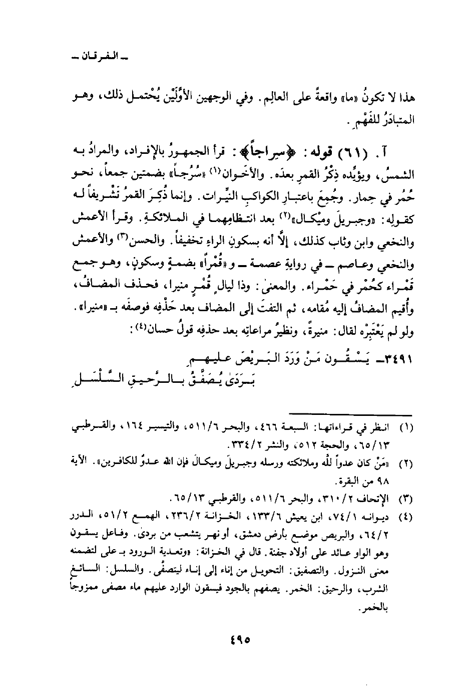 قوله: {سِرَاجاً} : قرأ الجمهورُ بالإِفراد، والمرادُ به الشمسُ، ويؤيِّده ذِكْرُ القمرِ بعدَه. والأخَوان «سُرُجاً» بضمتين جمعاً، نحو حُمُر في حِمار. وجُمِعَ باعتبارِ الكواكبِ النيِّرات. وإنما ذُكِرَ القمرُ تَشْريفاً له كقولِه: {وَجِبْرِيلَ وَمِيكَالَ} [البقرة: 98] بعد انتظامِهما في الملائكةِ. وقرأ الأعمش والنخعي وابن وثاب كذلك، إلاَّ أنه بسكونِ الراءِ تخفيفاً. والحسن والأعمش والنخعي وعاصم في روايةِ عصمة و «قُمْراً» بضمةٍ وسكونٍ، وهو جمع قَمْراء كحُمْر في حَمْراء. والمعنى: وذا ليالٍ قُمْرٍ منيرا، فحذف المضافُ، وأُقيم المضافُ إليه مُقامه، ثم التفتَ إلى المضاف بعد حَذْفِه فوصفَه ب «منيرا» . ولو لم يَعْتَبِرْه لقال: منيرةً، ونظيرُ مراعاتِه بعد حذفِه قولُ حسان: