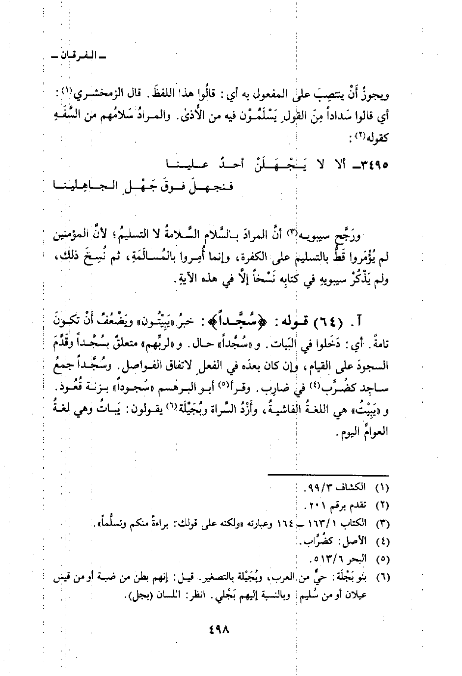 قوله: {سُجَّداً} : خبرُ «يَبِيْتُون» ويَضْعُفُ أَنْ تكونَ تامةَ. أي: دَخَلوا في البَيات. و «سُجَّداً» حال. و «لربِّهم» متعلقٌ بسُجَّداً وقَدَّمَ السجودَ على القيام، وإن كان بعدَه في الفعلِ لاتفاق الفواصل. وسُجَّداً جمعُ ساجِد كضُرِّب في ضارِب. وقرأ أبو البرهسم «سُجوداً» بزنة قُعُود. و «يَبِيْتُ» هي اللغةُ الفاشيةُ، وأَزْدُ السَّراة وبُجَيْلَة يقولون: يَباتُ وهي لغةُ العوامِّ اليوم.