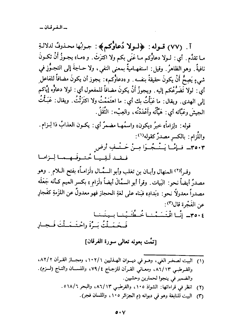 قوله: {لَوْلاَ دُعَآؤُكُمْ} : جوابُها محذوفٌ لدلالةِ ما تقدَّم. أي: لولا دعاؤُكم ما عَنَى بكم ولا اكترَثَ. و «ما» يجوزُ أَنْ تكونَ نافيةً. وهو الظاهرُ. وقيل: استفهاميةٌ بمعنى النفي، ولا حاجةَ إلى التجوُّزِ في شيءٍ يَصِحُّ أَنْ يكونَ حقيقةً بنفسه. و «دعاؤُكم» : يجوز أن يكونَ مضافَاً للفاعلِ أي: لولا تَضَرُّعُكم إليه. ويجوزُ أَنْ يكونَ مضافاً للمفعول أي: لولا دعاؤُه إيَّاكم إلى الهدى. ويقال: ما عَبَأْتُ بك أي: ما اهتَمَمْتُ ولا اكتَرَثْتُ. ويقال: عَبَأْتُ الجيشَ وعَبَّأته أي: هَيَّأْتُه وأَعْدَدْتُه، والعِبْء: الثِّقَلُ.