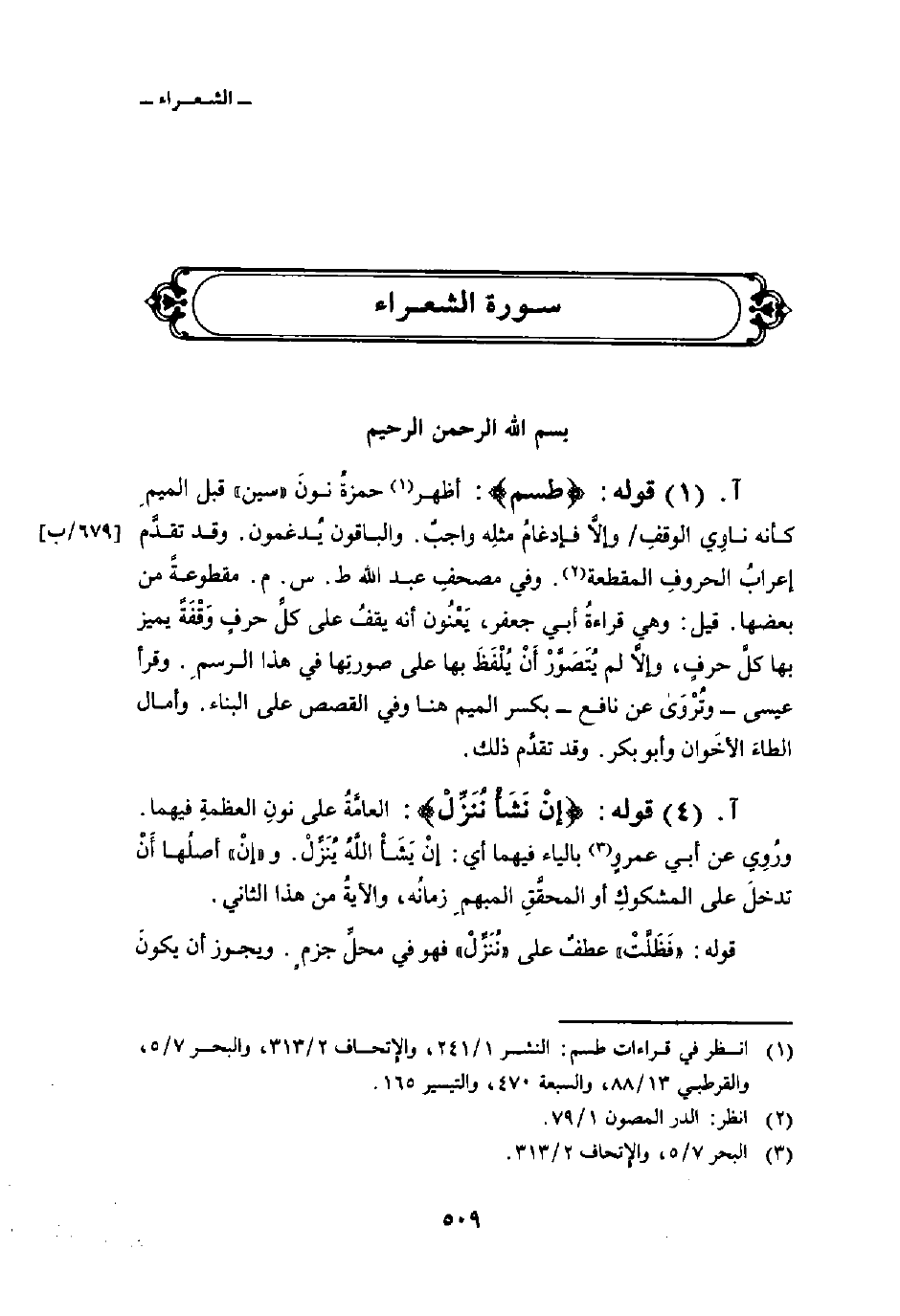 قوله: {طسم} : أظهر حمزةُ نونَ «سين» قبل الميمِ كأنه ناوِي الوقفِ/ وإلاَّ فإدغامُ مثلِه واجبٌ. والباقون يُدغمون. وقد تقدَّم إعرابُ الحروفِ المقطعة. وفي مصحفِ عبد الله ط. س. م. مقطوعةً من بعضها. قيل: وهي قراءةُ أبي جعفر، يَعْنُون أنه يقف على كلِّ حرفٍ وَقْفَةً يميز بها كلَّ حرفٍ، وإلاَّ لم يُتَصَوَّرْ أَنْ يُلْفَظُ بها على صورتِها في هذا الرسمِ. وقرأ عيسى وتروى عن نافع بكسر الميم هنا وفي القصص على البناء. وأمال الطاءَ الأخَوان وأبو بكر. وقد تقدَّم ذلك.