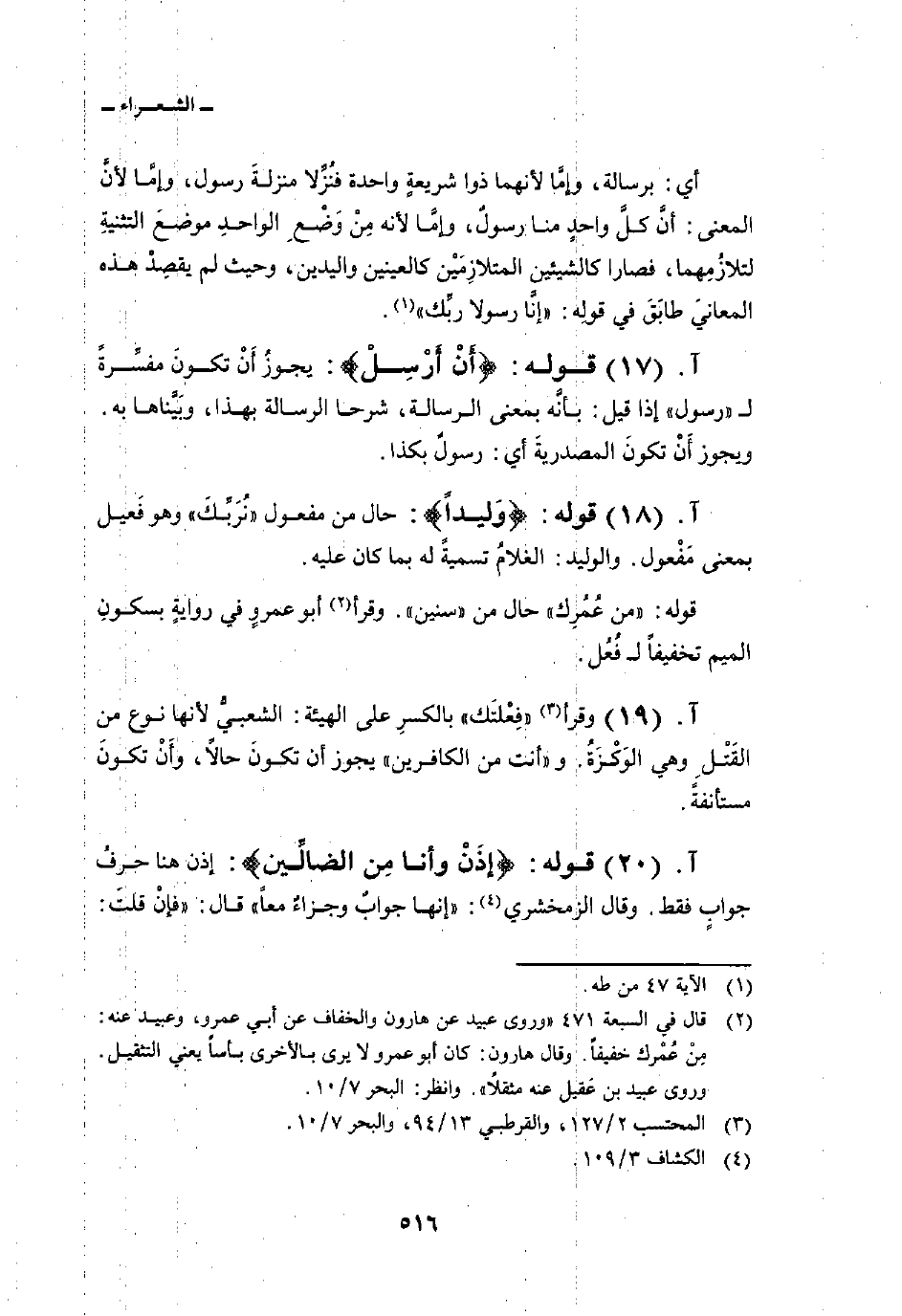 أي: برسالة، وإمَّا لأنهما ذوا شريعةٍ واحدة فنُزِّلا منزلةَ رسول، وإمَّا لأنَّ المعنى: أنَّ كلَّ واحدٍ منا رسولٌ، وإمَّا لأنه مِنْ وَضْعِ الواحدِ موضعَ التثينةِ لتلازُمِهما، فصارا كالشيئين المتلازِمَيْن كالعينين واليدين، وحيث لم يقصِدْ هذه المعانيَ طابَقَ في قولِه: {إِنَّا رَسُولاَ رَبِّكَ} [طه: 47] .