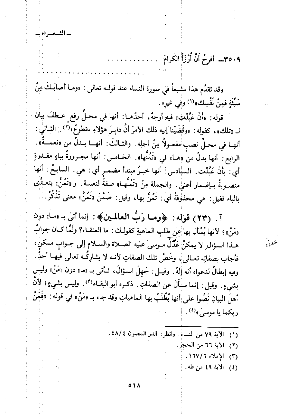 قوله: {وَمَا رَبُّ العالمين} : إنما أتى ب «ما» دون «مَنْ» ؛ لأنها يُسْأل بها عن طلبِ الماهيةِ كقولك: ما العنقاء؟ ولَمَّا كان جوابُ هذا السؤالِ لا يمكنُ عَدْلُ موسى عليه الصلاة والسلام إلى جوابٍ ممكنٍ، فأجاب بصفاتِه تعالى، وخَصَّ تلك الصفاتِ لأنه لا يشارِكُه تعالى فيها أحدٌ. وفيه إبطالٌ لدعواه أنه إلَهٌ. وقيل: جَهِلَ السؤالَ، فأتى ب «ما» دون «مَنْ» وليس بشيءٍ. وقيل: إنما سأَلَ عن الصفاتِ. ذكره أبو البقاء. وليس بشيءٍ؛ لأنَّ أهلَ البيانِ نَصُّوا على أنها يُطْلَبُ بها الماهياتِ وقد جاء ب «مَنْ» في قوله: {فَمَن رَّبُّكُمَا ياموسى} [طه: 49] .