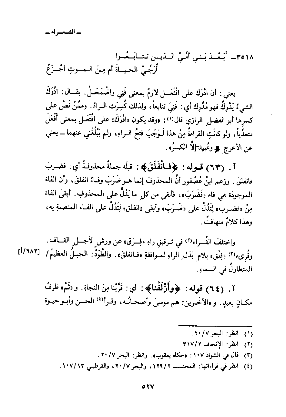 قوله: {فانفلق} : قبلَه جملةٌ محذوفةٌ أي: فضربَ فانفلقَ. وزعم ابنُ عُصْفور أنَّ المحذوفَ إنما هو ضَرَبَ وفاءُ انفلقَ، وأن الفاءَ الموجودَة هي فاء «فَضَرَبَ» ، فأبقى من كلٍ ما يُدْلُّ على المحذوفِ. أبقى الفاءَ مِنْ «فضرب» لِتَدُلَّ على «ضَرَبَ» وأبقى «انفلق» لِتَدُلَّ على الفاء المتصلةِ به، وهذا كلامٌ متهافتٌ.