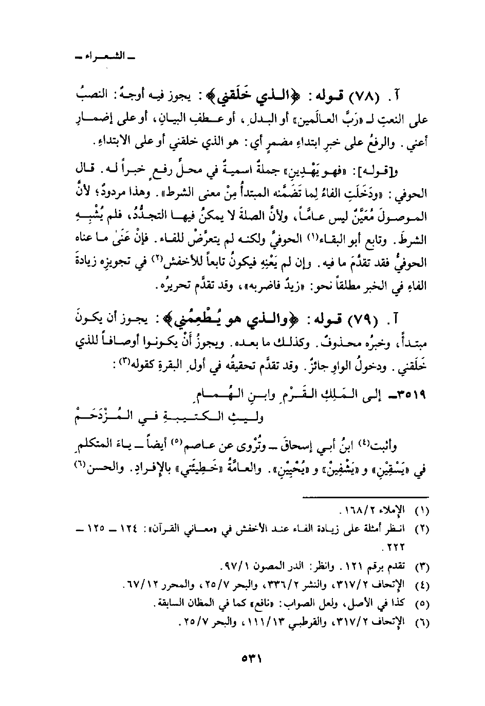 قوله: {والذي هُوَ يُطْعِمُنِي} : يجوز أن يكونَ مبتدأً، وخبرُه محذوفٌ. وكذلك ما بعده. ويجوزُ أَنْ يكونوا أوصافاً للذي خَلَقني. ودخولُ الواوِ جائزٌ. وقد تقدَّم تحقيقُه في أولِ البقرةِ كقوله: