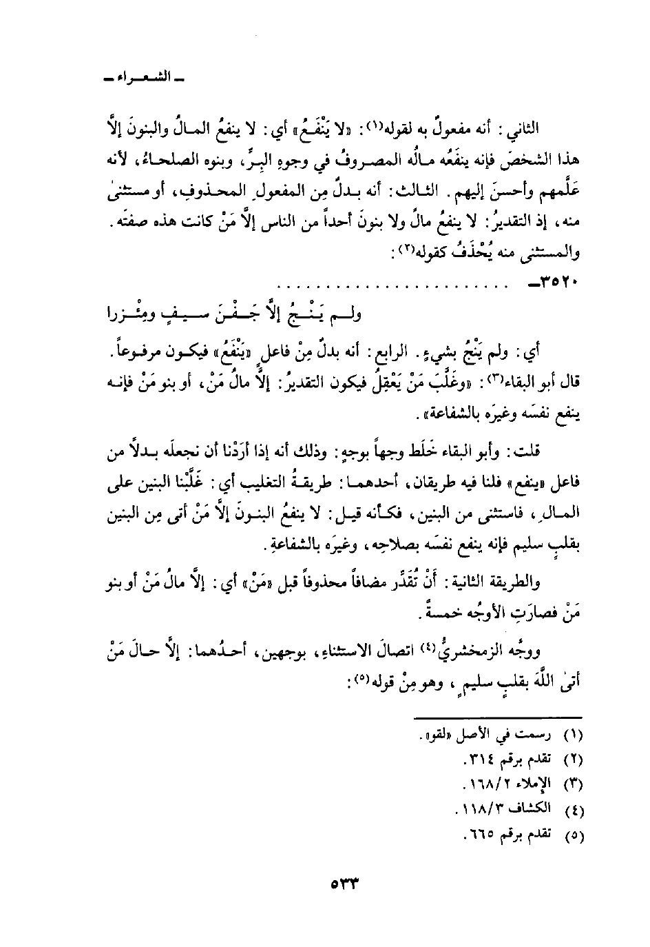 الثاني: أنه مفعولٌ به لقوله: «لا يَنْفَعُ» أي: لا ينفعُ المالُ والبنونَ إلاَّ هذا الشخصَ فإنه ينفَعُه فإنه ينفَعُه مالُه المصروفُ في وجوهِ البِرِّ، وبنوه الصلحاءُ، لأنه عَلَّمهم وأحسنَ إليهم. الثالث: أنه بدلٌ مِن المفعولِ المحذوفِ، أو مستثنى منه، إذ التقديرُ: لا ينفعُ مالٌ ولا بنونَ أحداً من الناس إلاَّ مَنْ كانت هذه صفتَه. والمستثنى منه يُحْذَفُ كقوله: