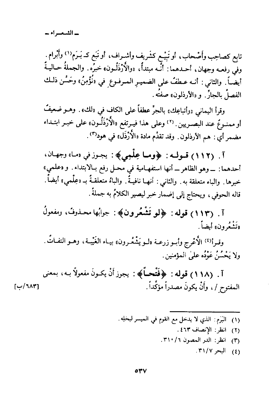 وقرأ اليماني: «وأتباعِك» بالجرِّ عطفاً على الكاف في «لك» . وهو ضعيفٌ أو ممنوعٌ عند البصريين. وعلى هذا فيرتفع «الأَرْذَلُون» على خبر ابتداء مضمر أي: هم الأرذلون. وقد تقدَّم مادة «الأَرْذَل» في هود.