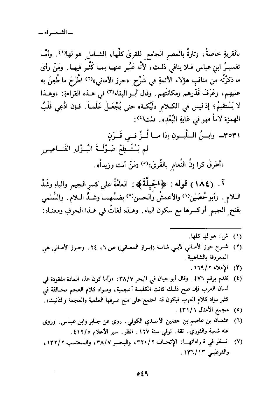 بالقريةِ خاصةً، وتارةً بالمصرِ الجامعِ للقرى كلِّها، الشاملِ هو لها. وأمَّا تفسيرُ ابنِ عباس فلا ينافي ذلك، لأنَّه عَبَّر عنها كَثُر فيها. ومَنْ رأى ما ذكرْتُه من مناقبِ هؤلاء الأئمةِ في شَرْحِ «حرز الأماني» اطَّرَحَ ما طُعِنَ به عليهم، وعَرَفَ قَدْرهم ومكانتَهم. وقال أبو البقاء في هذه القراءةِ: «وهذا لا يَسْتقيمُ؛ إذ ليس في الكلامِ» لَيْكة «حتى يُجْعَلَ عَلَماً. فإن ادُّعِي قَلْبُ الهمزة لاماً فهو في غايةِ البُعْدِ» . قلت: