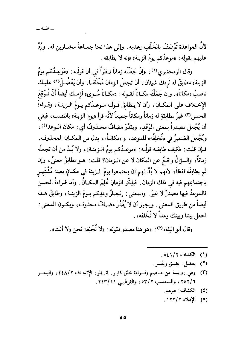 وقال الزمخشري: «إنْ جَعَلْتَه زماناً نظراً في أن قولَه: {مَوْعِدُكُمْ يَوْمُ الزينة} مطابقٌ له لَزِمك شيئان: أن تجعلَ الزمان مُخْلَفاً، وأن يَعْضُلَ عليك ناصبٌ» مكاناً «، وإن جَعَلْتَه مكاناً لقوله: {مَكَاناً سُوى} لَزِمك أيضاً أَنْ تُوْقِعَ الإِخلاف على المكان، وأن لا يطابِقَ قولَه موعدُكم يومُ الزينة، وقرءةُ الحسن غيرُ مطابقةٍ له زماناً ومكاناً جميعاً لأنَّه قرأ» يومَ الزينة «بالنصب، فبقي أن يُجْعل مصدراً بمعنى الوَعْدِ، ويقدَّرَ مضافٌ محذوفٌ أي: مكان الوعد، ويُجْعلَ ضميرُ في» نُخلِفُه «للموعِد، و» مكاناً «، بدل من المكان المحذوف. فإن قلت: فكيف طابقه قولُه: {مَوْعِدُكُمْ يَوْمُ الزينة} ، ولا بُدَّ من أن تجعلَه زماناً، والسؤالُ واقعٌ عن المكان لا عن الزمان؟ قلت: هو مطابقٌ معنىً، وإن لم يطابقْه لفظاً؛ لأنهم لا بُدَّ لهم أن يجتمعوا يومَ الزينة في مكانٍ بعينه مُشْتَهِرٍ باجتماعِهم فيه في ذلك الزمان. فبذِكْر الزمانِ عُلِمَ المكانُ. وأما قراءةُ الحسنِ فالموعدُ فيها مصدرٌ لا غيرَ. والمعنى: إنجازُ وعدِكم يومَ الزينة، وطابقَ هذا أيضاً من طريق المعنى. ويجوز أن لا يُقَدَّرَ مضافٌ محذوف، ويكون المعنى: اجعل بيننا وبينك وعداً لا نُخْلفه» .