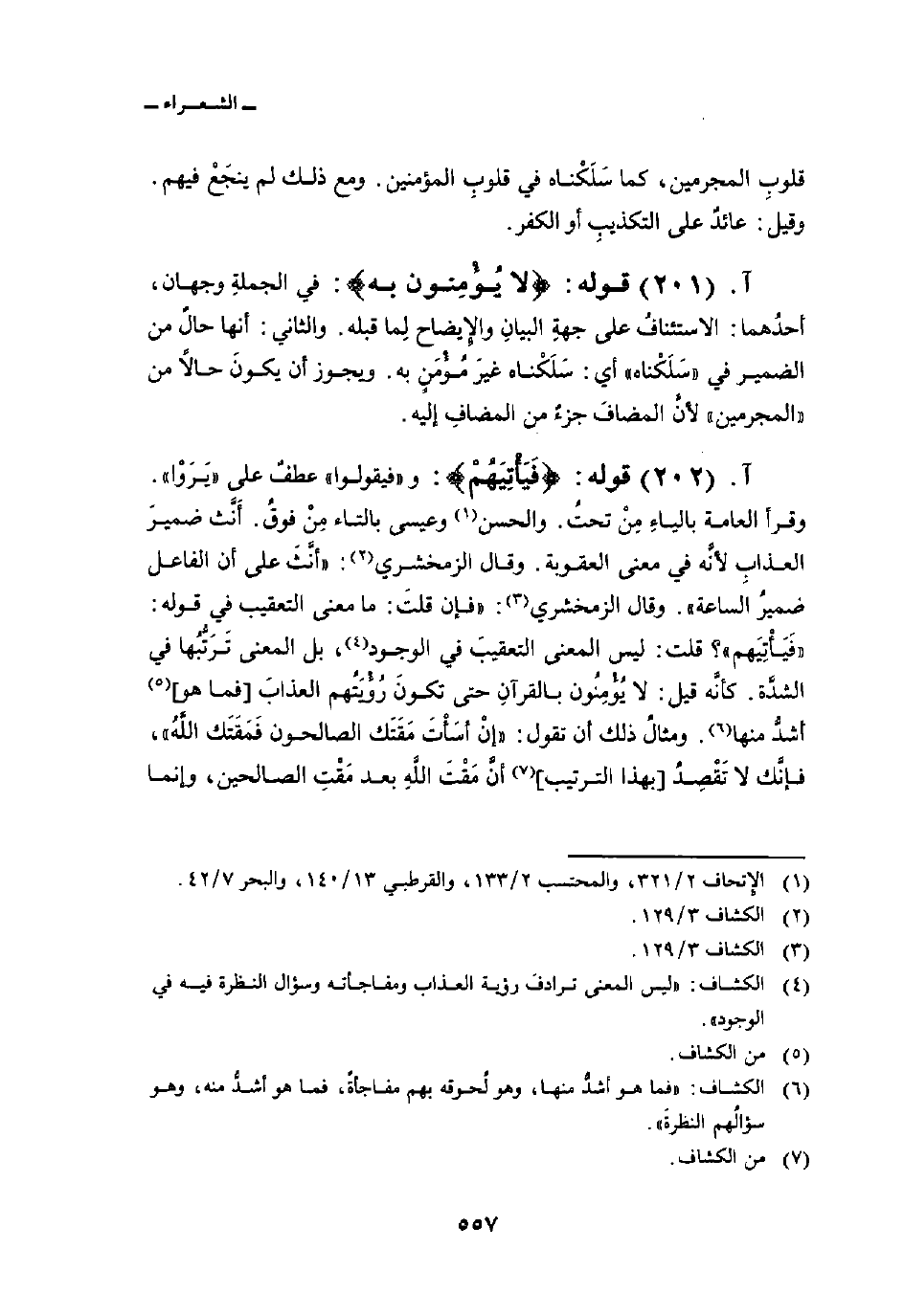 قوله: {لاَ يُؤْمِنُونَ بِهِ} : في الجملةِ وجهان، أحدُهما: الاستئنافُ على جهةِ البيانِ والإِيضاح لِما قبله. والثاني: أنها حالٌ من الضمير في «سَلَكْناه» أي: سَلَكْناه غيرَ مُؤْمَنٍ به. ويجوز أن يكونَ حالاً من «المجرمين» لأنَّ المضافَ جزءٌ من المضافِ إليه.
