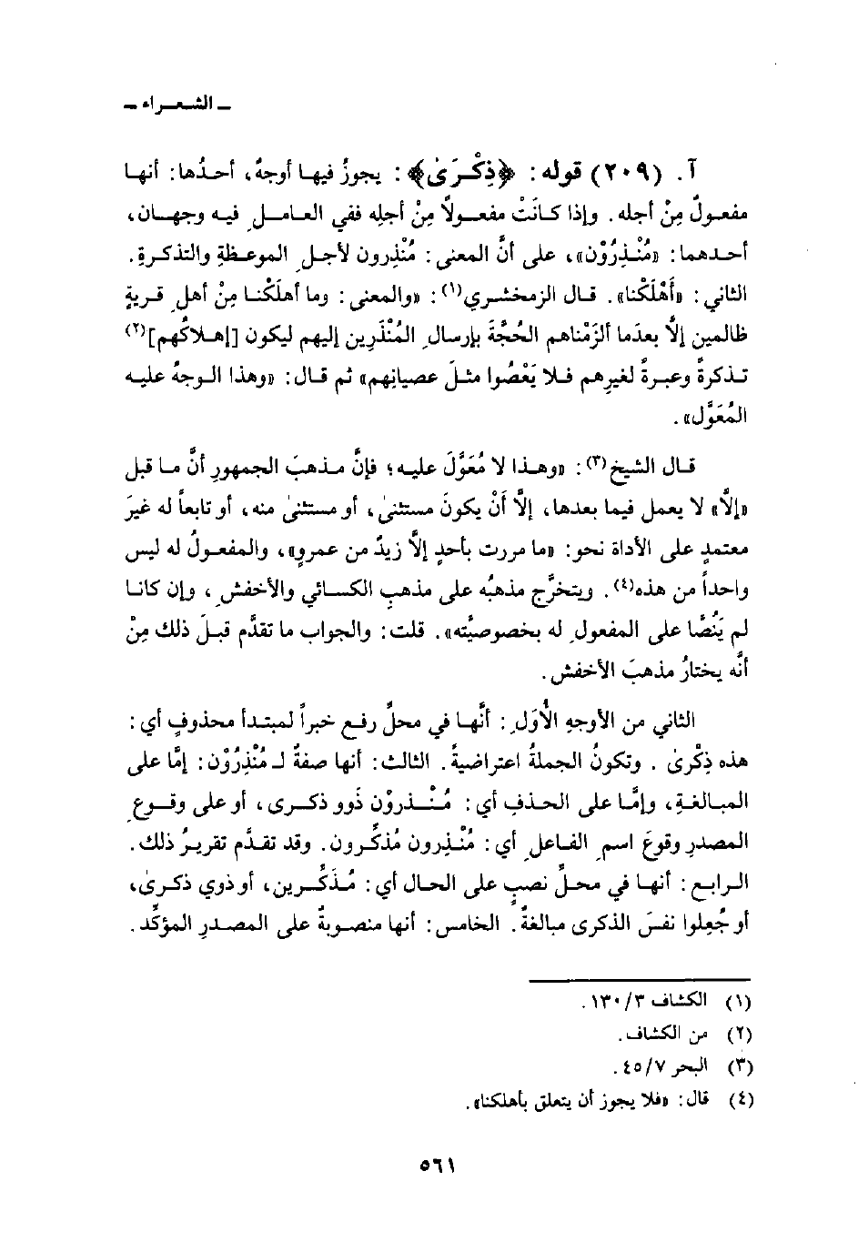 قوله: {ذكرى} : يجوزُ فيها أوجهٌ، أحدُها: أنها مفعولٌ مِنْ أجله. وإذا كانَتْ مفعولاً مِنْ أجلهِ ففي العاملِ فيه وجهان، أحدهما: «مُنْذِرُوْن» ، على أنَّ المعنى: مُنْذِرون لأجلِ الموعظةِ والتذكرةِ. الثاني: «أَهْلَكْنا» . قال الزمخشري: «والمعنى: وما أهلَكْنا مِنْ أهلِ قريةٍ ظالمين إلاَّ بعدَما ألزَمْناهم الحُجَّةَ بإرسالِ المُنْذَرِين إليهم ليكون [إهلاكُهم] تذكرةً وعبرةَ لغيرِهم فلا يَعْصُوا مثلَ عصيانِهم» ثم قال: «وهذا الوجهُ عليه المُعَوَّل» .