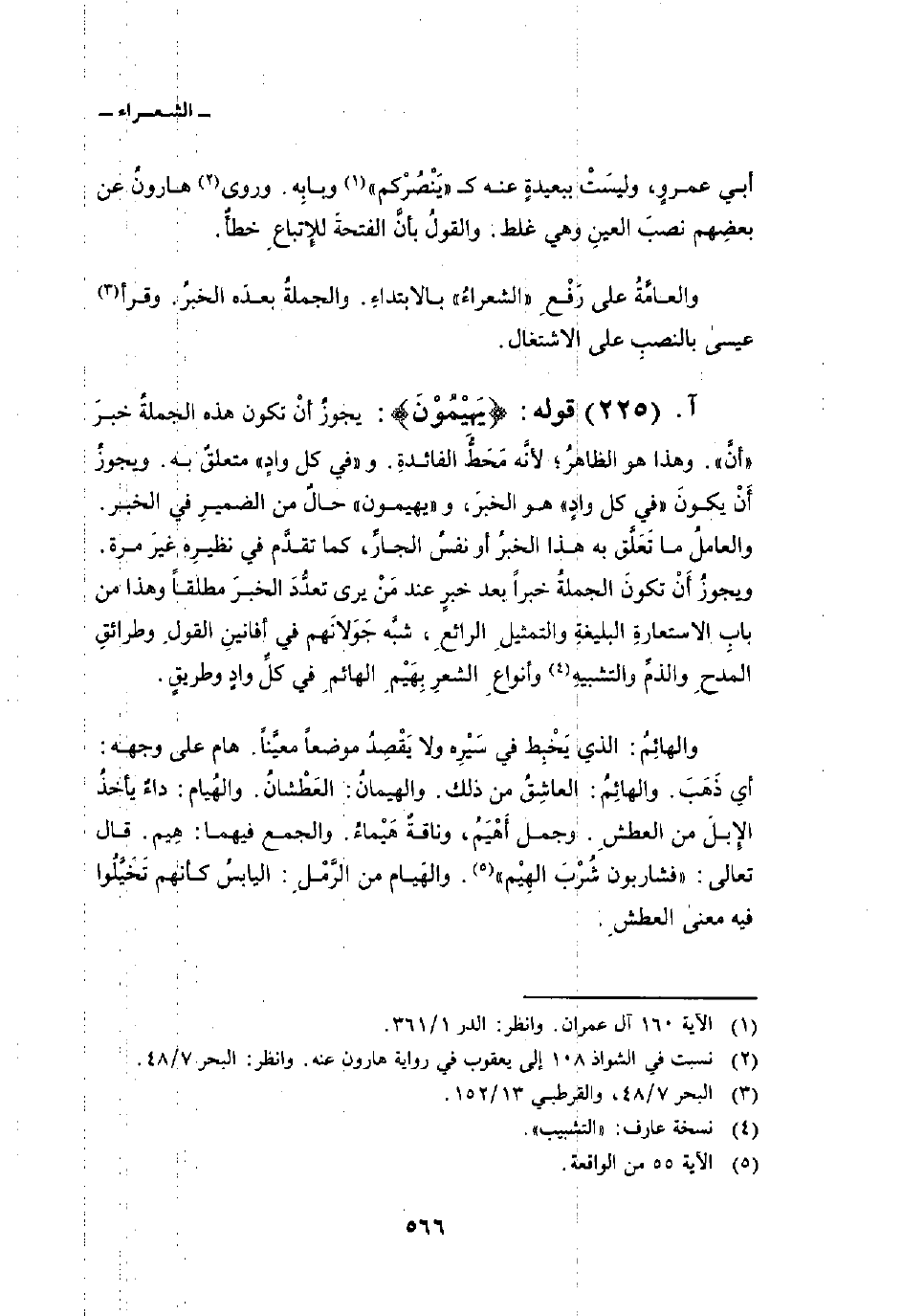 قوله: {يَهِيمُونَ} : يجوزُ أنْ تكون هذه الجملةُ خبرَ «أنَّ» . وهذا هو الظاهرُ؛ لأنَّه مَحَطُّ الفائدةِ. و «في كل وادٍ» متعلقٌ به. ويجوزُ أَنْ يكونَ «في كل وادٍ» هو الخبرَ، و «يهيمون» حالٌ من الضميرِ في الخبر. والعاملُ ما تَعَلَّق به هذا الخبرُ أو نفسُ الجارِّ، كما تقدَّم في نظيرِه غيرَ مرة. ويجوزُ أَنْ تكونَ الجملةُ خبراً بعد خبرٍ عند مَنْ يرى تعدُّدَ الخبرَ مطلقاً وهذا من بابِ الاستعارةِ البليغةِ والتمثيلِ الرائعِ، شبَّه جَوَلانَهم في أفانينِ القولِ وطرائقِ المدحِ والذمِّ والتشبيهِ وأنواعِ الشعرِ بِهَيْمِ الهائمِ في كلِّ وادٍ وطريقٍ.