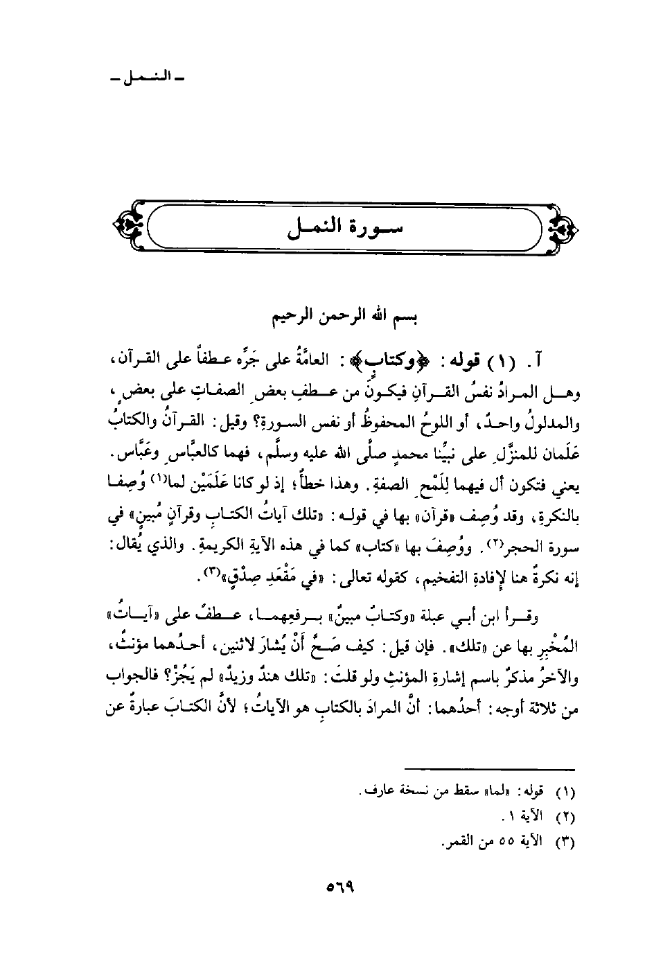 وقرأ ابن أبي عبلة «كتابٌ مبينٌ» برفعِهما، عطفٌ على «آياتُ» المُخْبِرِ بها عن «تلك» . فإن قيل: كيف صَحَّ أَنْ يُشارَ لاثنين، أحدُهما مؤنثٌ، والآخرُ مذكرٌ باسم إشارةِ المؤنثِ ولو قلتَ: «تلك هندٌ وزيدٌ» لم يَجُزْ؟ فالجواب من ثلاثةِ أوجه: أحدُهما: أنَّ المرادَ بالكتابِ هو الآياتُ؛ لأنَّ الكتابَ عبارةٌ عن