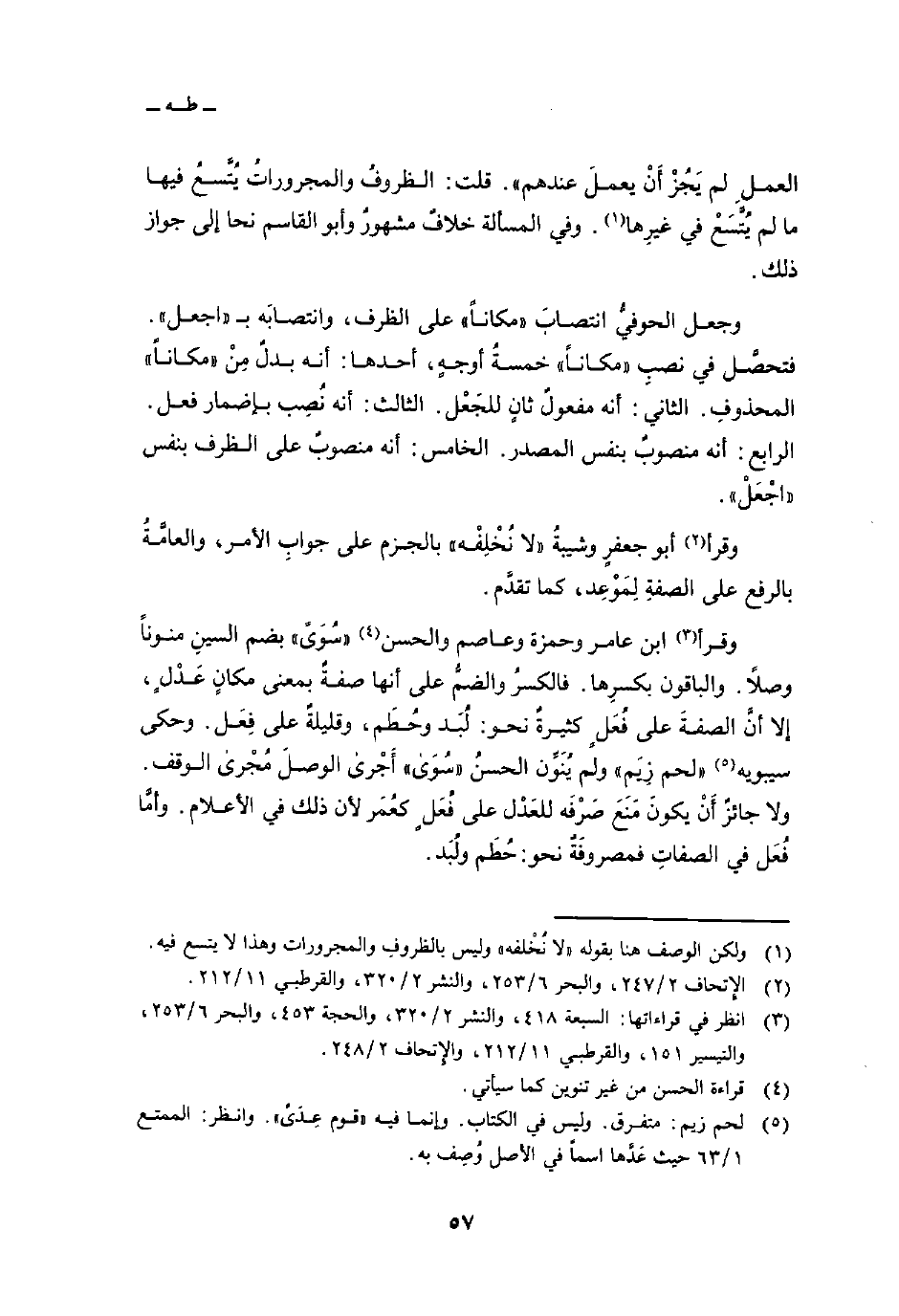وجعل الحوفيُّ انتصابَ «مكاناً» على الظرف، وانتصابَه ب «اجعل» . فتحصَّل في نصبِ «مكاناً» خمسةُ أوجهٍ، أحدها: أنه بدلٌ مِنْ «مكاناً» المحذوفِ. الثاني: أنه مفعولٌ ثانٍ للجَعْل. الثالث: أنه نُصِب بإضمار فعل. الرابع: أنه منصوبٌ بنفس المصدر. الخامس: أنه منصوبٌ على الظرف بنفس «اجْعَلْ» .