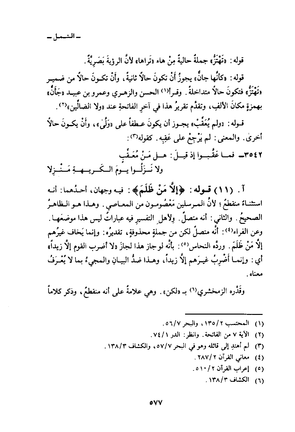 قوله: {إَلاَّ مَن ظَلَمَ} : فيه وجهان، أحدُهما: أنه استثناءٌ منقطعٌ؛ لأنَّ المرسلين مَعْصُومون من المعاصي. وهذا هو الظاهرُ الصحيحُ. والثاني: أنه متصلٌ. وِلأهلِ التفسيرِ فيه عباراتٌ ليس هذا موضعَها. وعن الفراء: أنَّه متصلٌ. لكن من جملةٍ محذوفةٍ، تقديرُه: وإنما يَخاف غيرُهم إلاَّ مَنْ ظَلَمَ. وردَّه النحاس: بأنه لو جاز هذا لجازَ «لا أضرب القوم إلاَّ زيداً» أي: وإنما أَضْرِبُ غيرَهم إلاَّ زيداً، وهذا ضدُّ البيانِ والمجيءُ بما لا يُعْرَفُ معناه.