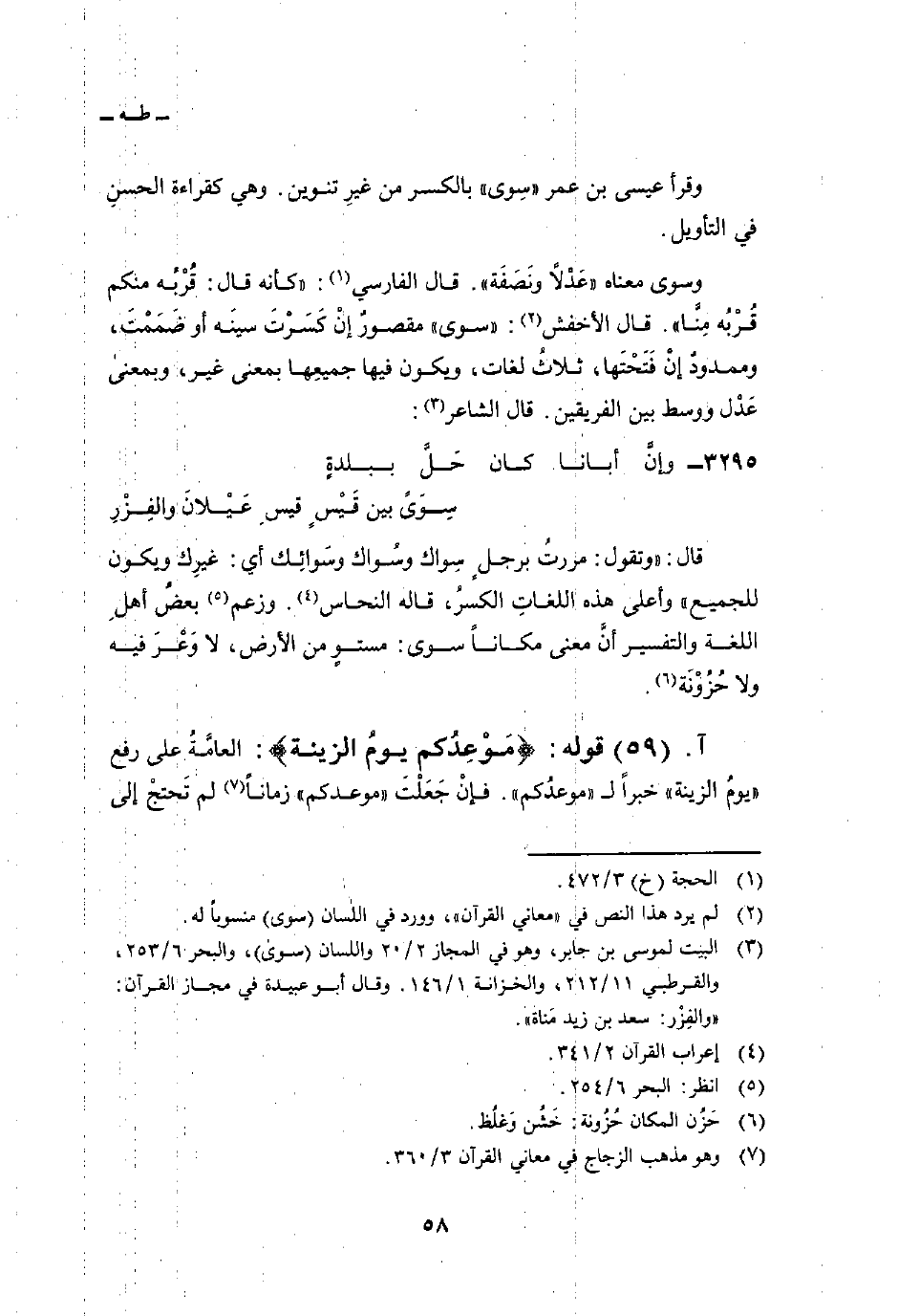 وسوى معناه «عَدْلاً ونَصَفَة» . قال الفارسي: «كأنه قال: قُرْبُه منكم قُرْبُه مِنَّا» . قال الأخفش: «سوى» مقصورٌ إنْ كَسَرْتَ سينَه أو ضَمَمْتَ، وممدودٌ إنْ فَتَحْتَها، ثلاثُ لغات، ويكون فيها جميعها بمعنى غير، وبمعنى عَدْل ووسط بين الفريقين. قال الشاعر: