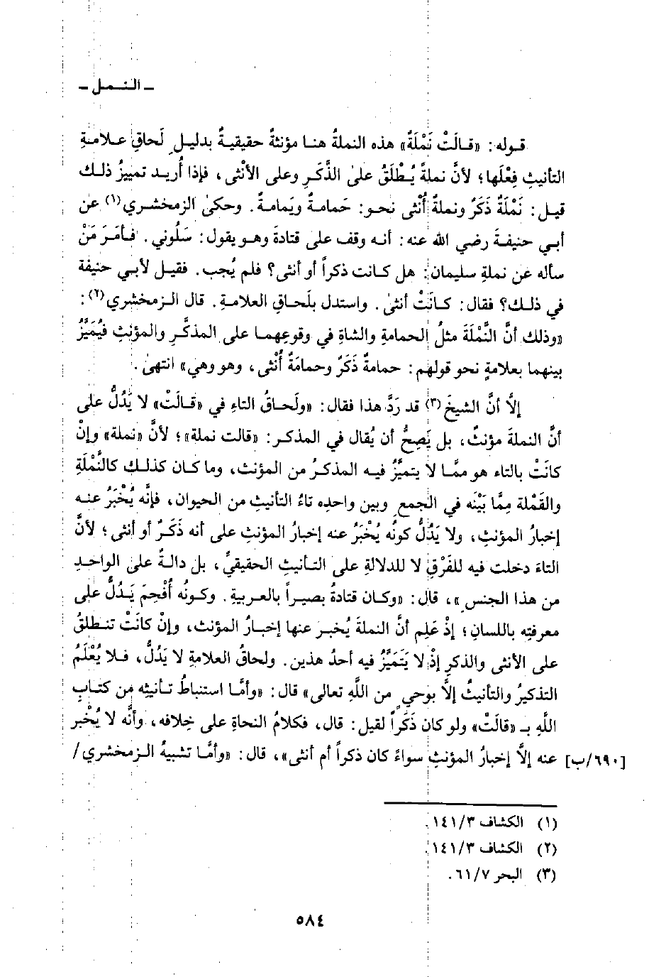 وكونُه أُفْحِمَ يَدُلُّ على معرفتهِ باللسانِ؛ إذْ عَلِم أنَّ النملةَ يُخبر عنها إخبارُ المؤنث، وإنْ كانَتْ تنطلقُ على الأنثى والذكرِ إذْ لا يَتَمَيَّزُ فيه أحدُ هذين. ولحاقُ العلامةِ لا يَدُلُّ، فلا يُعْلَمُ التذكيرُ والتأنيثُ إلاَّ بوحيٍ من اللهِ تعالى «قال:» وأمَّا استنباطُ تأنيثِه من كتابِ اللهِ ب «قالَتْ» ولو كان ذَكَراً لقيل: قال، فكلامُ النحاةِ على خِلافه، وأنَّه لا يُخْبر عنه ألاَّ إخبارُ المؤنثِ سواءً كان ذكراً أم أنثى «، قال:» وأمَّا تشبيهُ الزمخشري/