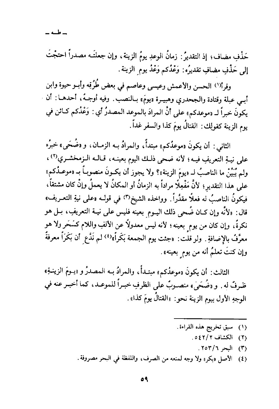 الثاني: أن يكونَ «موعدُكم» مبتدأً، والمرادُ به الزمان، و «ضُحَى» خبرُه على نيةِ التعريفِ فيه؛ لأنه ضحى ذلك اليوم بعينه، قاله الزمخشري، ولم يُبَيِّنْ ما الناصبُ ل «يومَ الزينة» ؟ ولا يجوز أن يكونَ منصوباً، ب «موعدُكم» على هذا التقديرِ؛ لأنَّ مَفْعِلاً مراداً به الزمانُ أو المكانُ لا يعملُ وإنْ كان مشتقاً، فيكونُ الناصبُ له فعلاً مقدَّراً. وواخذه الشيخ في قوله «على نيةِ التعريف» قال: «لأنَّه وإن كان ضُحى ذلك اليومِ بعينه فليس على نية التعريفِ، بل هو نكرةٌ، وإن كان من يومٍ بعينه؛ لأنه ليس معدولاً عن الألفِ واللام كسَحَر ولا هو معرَّفٌ بالإِضافةِ ولو قلت:» جئت يوم الجمعة بَكَراً «لم نَدَّعِ أن بَكَراً معرفةٌ وإن كنت تعلمُ أنه من يومٍ بعينه» .