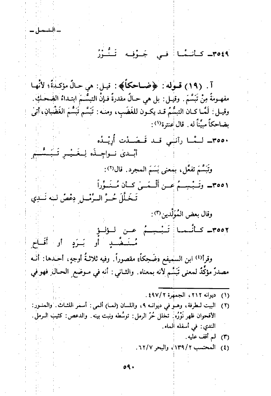 3551 - وتَبْسِمُ عن ألمى كأن مُنَوَّراً ... تَخَلَّلَ حُرَّ الرَّمْلِ دِعْصٌ له نَدِي