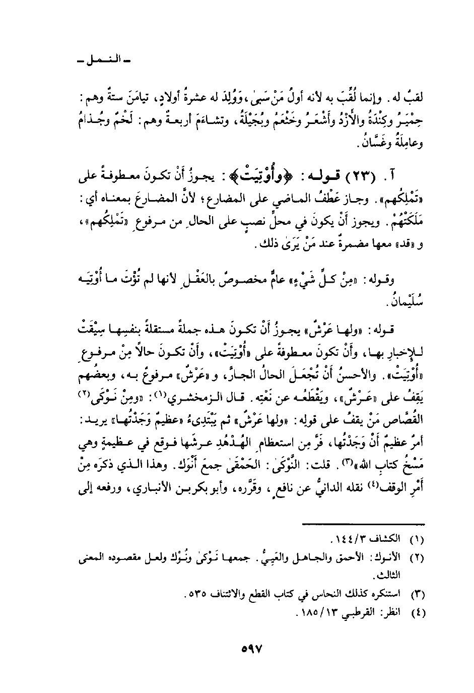 قوله: {وَلَهَا عَرْشٌ} يجوزُ أَنْ تكونَ هذه جملةً مستقلةً بنفسِها سِيْقَتْ للإِخبارِ بها، وأَنْ تكونَ معطوفةً على «أُوْتِيَتْ» ، وأَنْ تكونَ حالاً مِنْ مرفوعِ «أُوْتِيَتْ» . والأحسنُ أَنْ تُجْعَلَ الحالُ الجارَّ، و «عَرْشٌ» مرفوعٌ به، وبعضُهم يَقِفُ على «عَرْشٌ» ، ويَقْطَعُه عن نَعْتِه. قال الزمخشري: «ومِنْ نَوْكَى القُصَّاص مَنْ يقفُ على قولِه: {وَلَهَا عَرْشٌ} ثم يَبْتَدِىءُ» عظيمٌ وَجَدْتُها «يريد: أمرٌ عظيمٌ أَنْ وَجَدْتُها، فَرَّ مِنْ استعظامِ الهُدْهُدِ عرشَها فوقع في عظيمةٍ وهي مَسْخُ كتابِ الله» . قلت: النوكى: الحمقى جمعَ أَنْوكِ. وهذا الذي ذكرَه مِنْ أَمْرِ الوقف نقله الدانيُّ عن نافعٍ، وقَرَّره، وأبو بكر بن الأنباري، ورفعه إلى