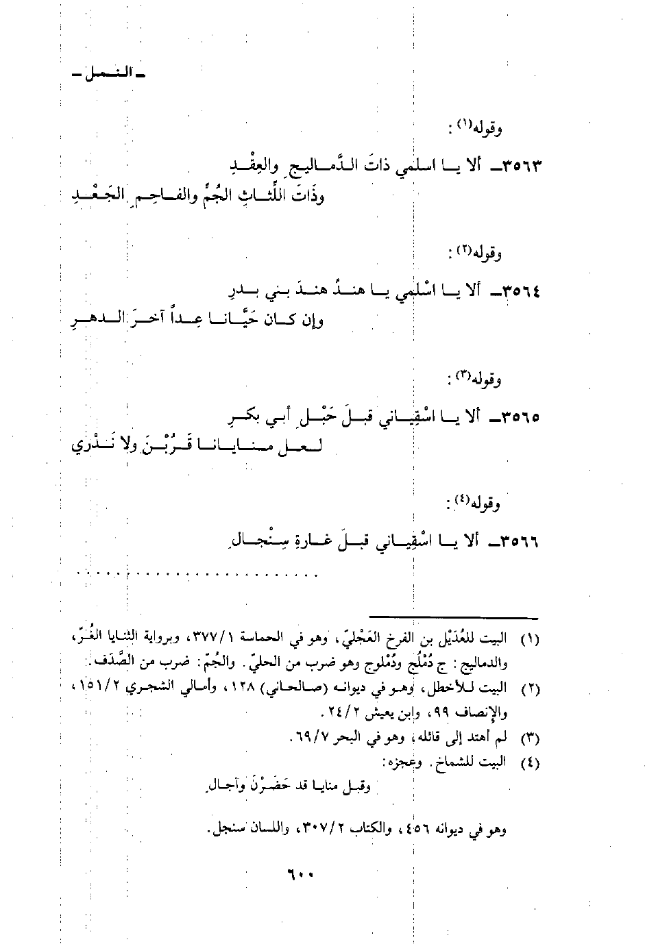 3563 - ألا يا اسلمي ذاتَ الدَّماليجِ والعِقْدِ ... وذَاتَ اللِّثاثِ الجُمِّ والفاحِمِ الجَعْدِ