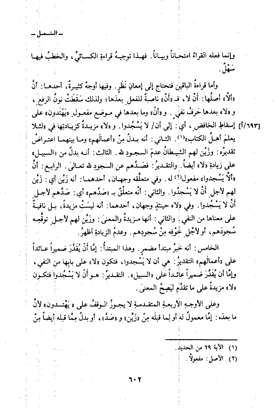وأما قراءةُ الباقين فتحتاج إلى إمعانِ نَظَرٍ. وفيه أوجهٌ كثيرةٌ، أحدها: أنَّ «ألاَّ» أصلُها: أَنْ لا، ف «أنْ» ناصبةٌ للفعلِ بعدَها؛ ولذلك سَقَطَتْ نونُ الرفعِ، و «لا» بعدها حَرفُ نفيٍ. و «أنْ» وما بعدها في موضع مفعولِ «يَهْتَدون» على إسقاطِ الخافضِ، أي: إلى أن/ لا يَسْجُدوا. و «لا» مزيدةٌ كزيادتِها في {لِّئَلاَّ يَعْلَمَ أَهْلُ الكتاب} [الحديد: 29] . الثاني: أنه بدلٌ مِنْ «أعمالَهم» وما بينهما اعتراضٌ تقديرُه: وزَيَّن لهم الشيطانُ عدمَ السجودِ لله. الثالث: أنه بدلٌ من «السبيل» على زيادةِ «لا» أيضاً. والتقديرُ: فصَدَّهم عن السجودِ لله تعالى. الرابع: أنَّ {أَلاَّ يَسْجُدُواْ} مفعول له. وفي متعلَّقه وجهان، أحدهما: أنه زَيَّن أي: زَيَّن لهم لأجلِ أَنْ لا يَسْجدُوا. والثاني: أنَّه متعلِّقٌ ب «صَدَّهم» أي: صَدَّهم لأجلِ أَنْ لا يَسْجُدوا. وفي «لا» حينئذٍ وجهان، أحدهما: أنه ليسَتْ مزيدةً، بل نافيةٌ على معناها من النفي. والثاني: أنها مزيدةٌ والمعنى: وزَيَّن لهم لأجلِ توقُّعِه سُجودَهم، أو لأجْلِ خَوْفِه مِنْ سُجودِهم. وعدمُ الزيادةِ أظهرُ.