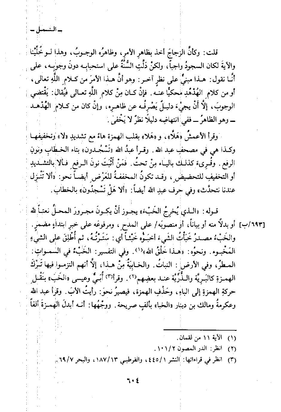 وقرأ الأعمشُ «هَلاَّ» ، و «هَلا» بقلب الهمزة هاءً مع تشديدِ «لا» وتخفيفها وكذا هي في مصحفِ عبد الله. وقرأ عبدُ الله «تَسْجُدون» بتاء الخطابِ ونونِ الرفع. وقُرِىءَ كذلك بالياءِ مِنْ تحتُ. فمَنْ أَثْبَتَ نونَ الرفعِ فألا بالتشديدِ أو التخفيفِ للتحضيضِ، وقد تكونُ المخففةُ للعَرْضِ أيضاً نحو: «ألا تَنْزِل عندنا نتحدَّث» وفي حرف عبدِ الله أيضاً: «ألا هَلْ تَسْجدُون» بالخطاب.