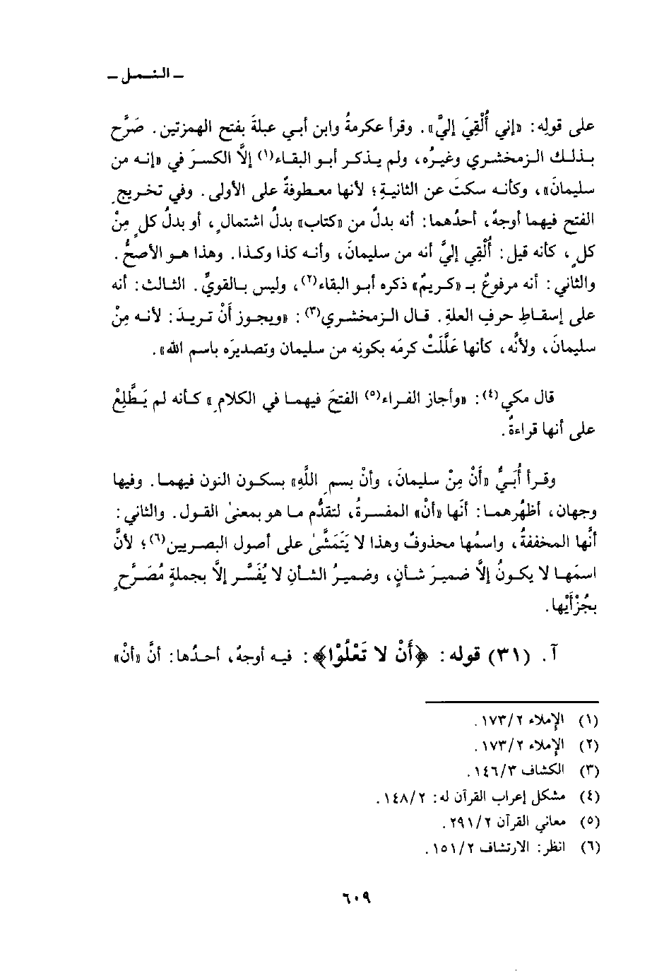 على قولِه: {إني أُلْقِيَ إِلَيَّ} . وقرأ عكرمةُ وابن أبي عبلةَ بفتح الهمزتين. صَرَّح بذلك الزمخشري وغيرُه، ولم يذكر أبو البقاء إلاَّ الكسرَ في «إنه من سليمان» ، وكأنه سكتَ عن الثانيةِ؛ لأنها معطوفةٌ على الأولى. وفي تخريجِ الفتح فيهما أوجهٌ، أحدُهما: أنه بدلٌ من «كتاب» بدلُ اشتمالٍ، أو بدلُ كلٍ مِنْ كلٍ، كأنه قيل: أُلْقِي إليَّ أنه من سليمانَ، وأنه كذا وكذا. وهذا هو الأصحُّ. والثاني: أنه مرفوعٌ ب «كريمٌ» ذكره أبو البقاء، وليس بالقويِّ. الثالث: أنه على إسقاطِ حرفِ العلةِ. قال الزمشخري: «ويجوز أَنْ تريدَ: لأنه مِنْ سليمانَ، ولأنَّه، كأنها عَلَّلَتْ كرمَه بكونِه من سليمان وتصديرَه باسم الله» .