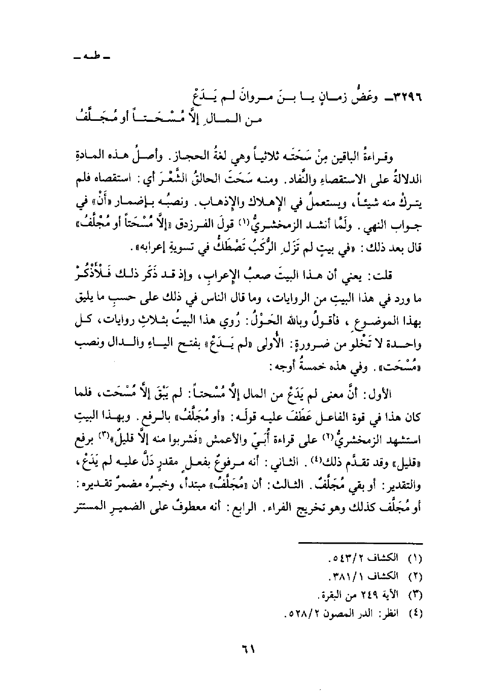 الأول: أنَّ معنى لم يَدَعْ من المال إلاَّ مُسْحتاً: لم يَبْقَ إلاَّ مُسْحَت، فلما كان هذا في قوة الفاعل عَطَفَ عليه قولَه: «أو مُجَلَّفُ» بالرفع. وبهذا البيتِ استشهد الزمخشريُّ على قراءة أُبَيّ والأعمش «فَشربوا منه إلاَّ قليلٌ» برفع «قليل» وقد تقدَّم ذلك. الثاني: أنه مرفوعٌ بفعلٍ مقدرٍ دَلَّ عليه لم يَدَعْ، والتقدير: أو بقي مُجَلَّفٌ. الثالث: «أن» مُجَلَّفُ «مبتدأ، وخبرُه مضمرٌ تقديره: أو مُجَلَّف كذلك وهو تخريج الفراء. الرابع: أنه معطوفٌ على الضميرِ المستتر
