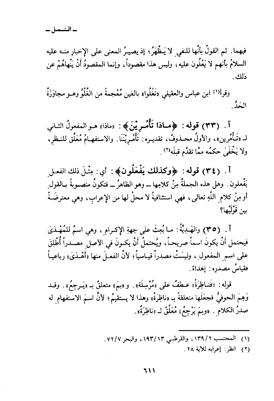 قوله: {فَنَاظِرَةٌ} : عطفٌ على «مُرْسِلَة» . و «بمَ» متعلقٌ ب «يَرجِعُ» . وقد وَهِمَ الحوفيُّ فجعَلَها متعلقةً ب «ناظِرَةٌ» وهذا لا يستقيمُ؛ لأنَّ اسمَ الاستفهامِ له صدرُ الكلامِ. «وبمَ يَرْجِعُ» مُعَلِّقٌ ل «ناظِرَةٌ» .