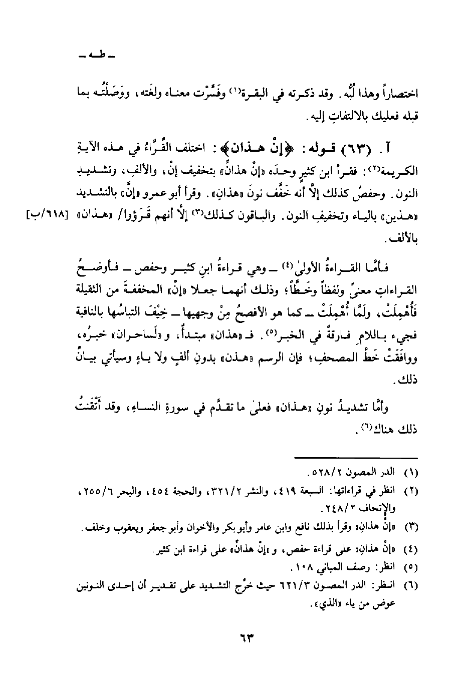وأمَّا تشديدُ نونِ «هذان» فعلى ما تقدَّم في سورةِ النساءِ، وقد أَتْقَنتُ ذلك هناك.