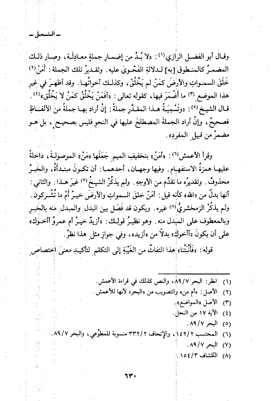 وقال أبو الفضل الرازي: «لا بُدَّ من إضمارِ جملةٍ معادِلةَ، وصار ذلك المضمرُ كالمنطوق [به] لدلالةِ الفحوى عليه. وتقديرُ تلك الجملة: أَمَنْ خَلَقَ السماواتِ والأرضَ كمَنْ لم يَخْلُقْ، وكذلك أخواتُها. وقد أظهرَ في غيرِ هذا الموضعِ ما أَضْمَرَ فيها، كقولِه تعالى: {أَفَمَن يَخْلُقُ كَمَن لاَّ يَخْلُقُ} [النحل: 17] . قال الشيخ:» وتَسْمِيَةُ هذا المقدَّرِ جملةً: إنْ أراد بها جملةً من الألفاظِ فصحيحٌ، وإنْ أراد الجملةَ المصطلحَ عليها في النحوِ فليس بصحيحٍ، بل هو مضمرٌ من قبيلِ المفردِ «.