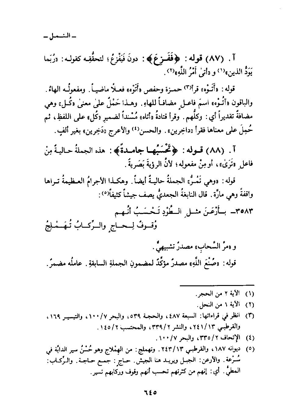 قوله: {تَحْسَبُهَا جَامِدَةً} : هذه الجملةُ حاليةٌ مِنْ فاعلِ «ترى» ، أو مِنْ مفعولهِ؛ لأنَّ الرؤيةَ بَصَريةٌ.