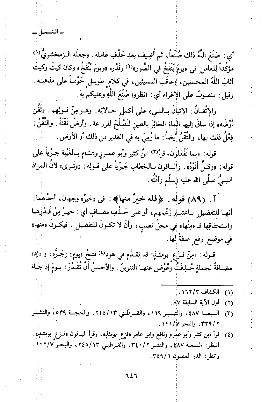 أي: صَنَعَ اللهُ ذلك صُنْعاً، ثم أُضِيف بعد حَذْفِ عامِله. وجعلَه الزمخشريُّ مؤكِّداً للعاملِ في {يَوْمَ يُنفَخُ فِي الصور} [النمل: 87] وقَدَّره «ويومَ يُنْفَخُ» وكان كيتَ وكيتَ أثابَ اللهُ المحسنين، وعاقَبَ المسيئين، في كلامٍ طويلٍ حَوْماً على مذهبه. وقيل: منصوبٌ على الإِغراء أي: انظروا صُنْعَ اللهِ وعليكم به.