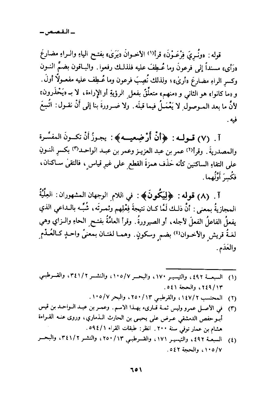 قوله: {وَنُرِيَ فِرْعَوْنَ} قرأ الأخوانَ «يرى» بفتح الياءِ والراءِ مضارعَ «رَأى» مسنداً إلى فرعونَ وما عُطِفَ عليه فلذلك رفعوا. والباقون بضمِّ النون وكسرِ الراءِ مضارعَ «أرى» ؛ ولذلك نُصِبَ فرعنن وما عُطِف عليه مفعولاً أولَ. و «ما كانوا» هو الثاني و «منهم» متعلِّقٌ بفعلِ الرؤيةِ أو الإِراءة، لا ب «يَحْذَرون» لأنَّ ما بعد الموصولِ لا يَعْمَلُ فيما قبلَه. ولا ضرورةَ بنا إلى أَنْ نقول: اتُسِعَ فيه.