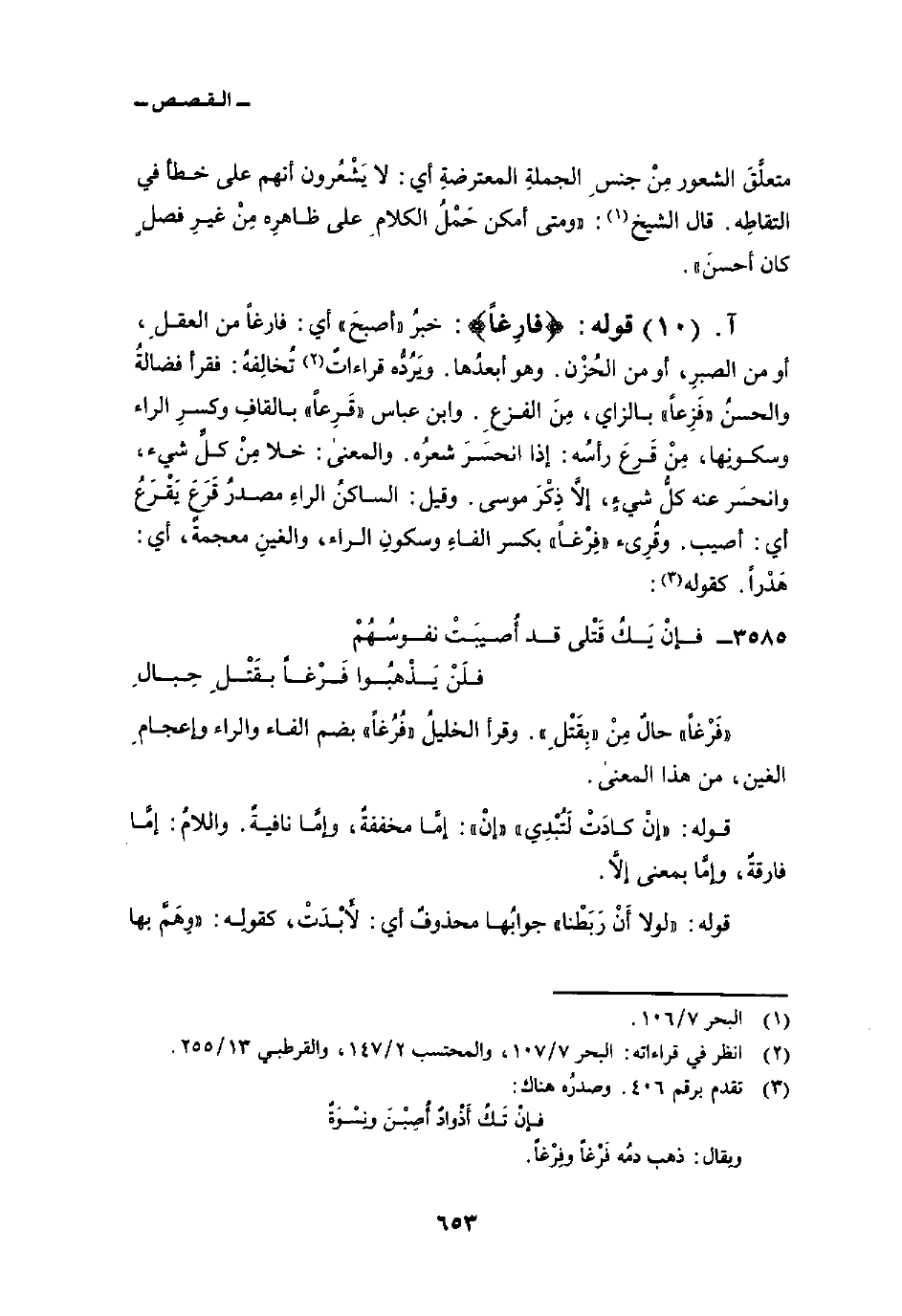 قوله: {فَارِغاً} : خبرُ «أصبحَ» أي: فارغاً من العقلِ، أو من الصبرِ، أو من الحُزْن. وهو أبعدُها. ويَرُدُّه قراءاتٌ تُخالِفهُ: فقرأ فضالةُ والحسنُ «فَزِعاً» بالزاي، مِنَ الفزعِ. وابن عباس «قَرِعاً» بالقافِ وكسرِ الراء وسكونِها، مِنْ قَرِِعَ رأسُه: إذا انحسَرَ شعرُه. والمعنى: خلا مِنْ كلِّ شيء، وانحسَر عنه كلُّ شيءٍ، إلاَّ ذِكْرَ موسى. وقيل: الساكنُ الراءِ مصدرُ قَرَعَ يَقْرَعُ أي: أصيب. وقُرِىء «فِرْغاً» بكسر الفاءِ وسكونِ الراء. والغينِ معجمةً، أي: هَدْراً. كقوله:
