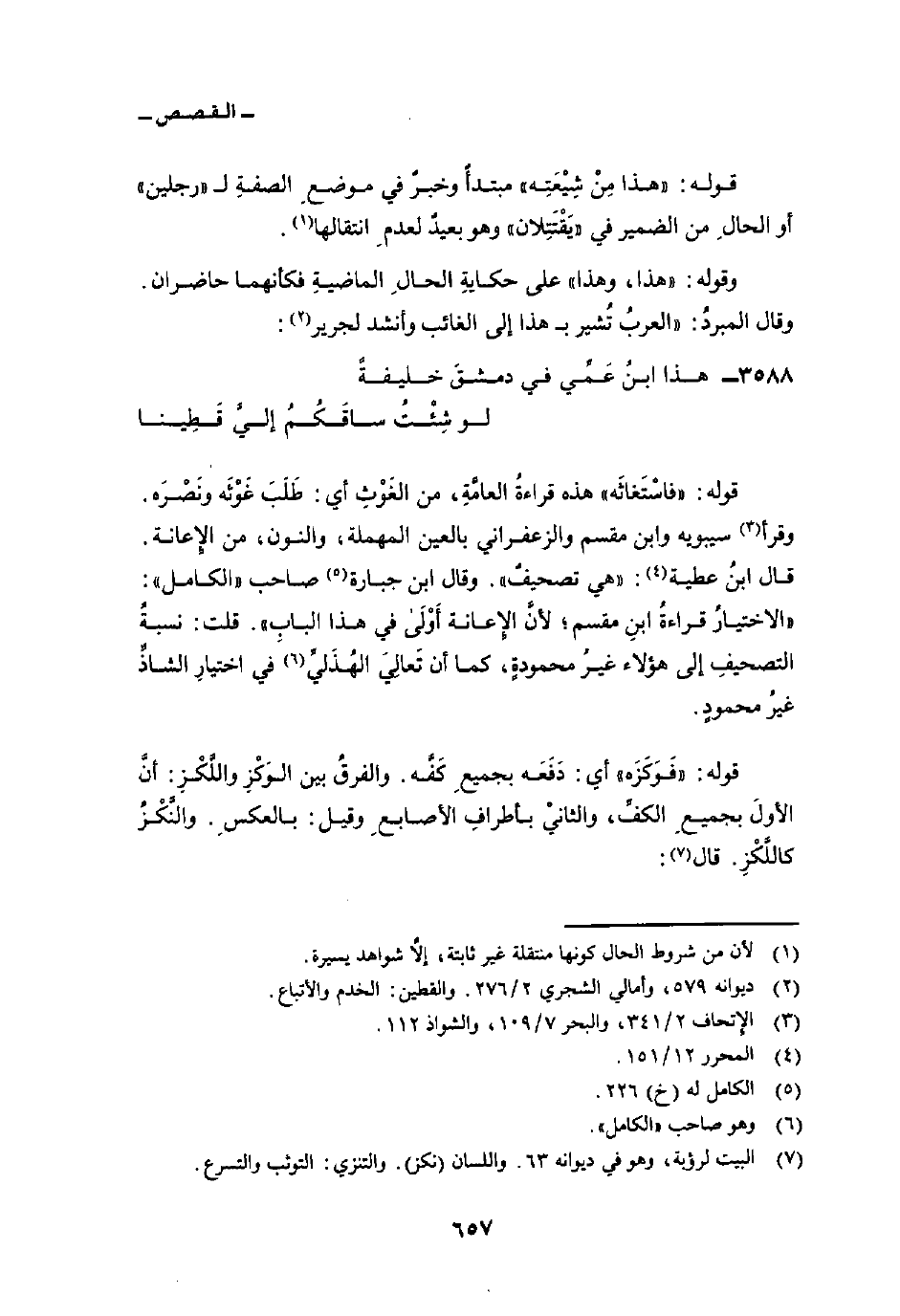قوله: {فاستغاثه} هذه قراءةُ العامَّةِ، من الغَوْثِ أي: طَلَبَ غَوْثَه ونَصْرَه. وقرأ سيبويه وابن مقسم والزعفراني بالعين المهملة، والنون، من الإِعانة. قال ابنُ عطية:» هي تصحيفٌ «. وقال ابن جبارة صاحب» الكامل «:» الاختيارُ قراءةُ ابنِ مقسم؛ لأنَّ الإِعانة أولى في هذا البابِ «. قلت: نسبةُ التصحيفِ إلى هؤلاء غيرُ محمودةٍ، كما أن تَعالِيَ الهُذَليِّ في اختيارِ الشاذِّ غيرُ محمودٍ.