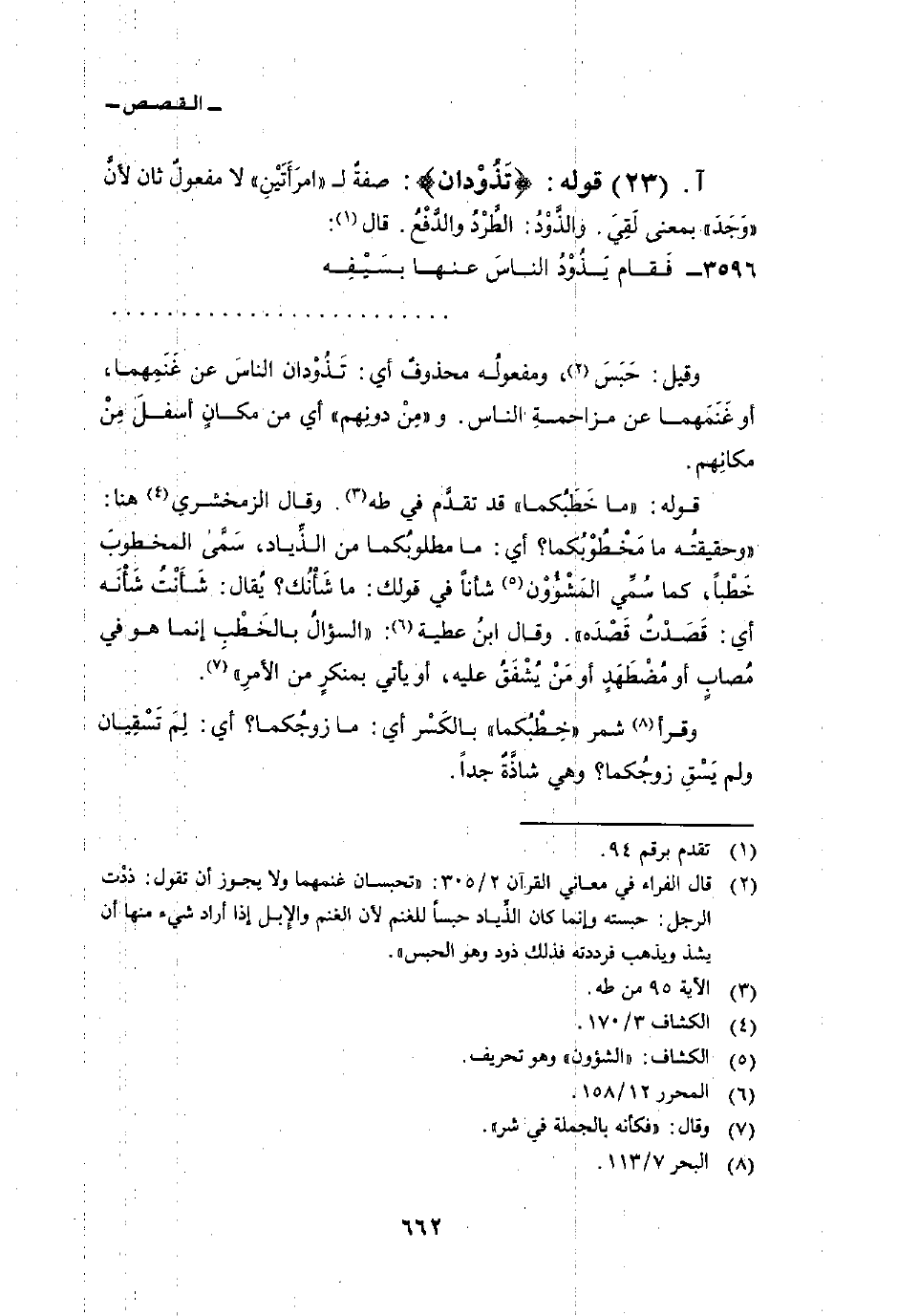 قوله: {تَذُودَانِ} : صفةٌ ل «امرَأَتَيْنِ» لا مفعولٌ ثان لأنَّ «وَجَدَ» بمعنى لَقِيَ. والذَّوْدُ: الطَّرْدُ والدَّفْعُ قال: