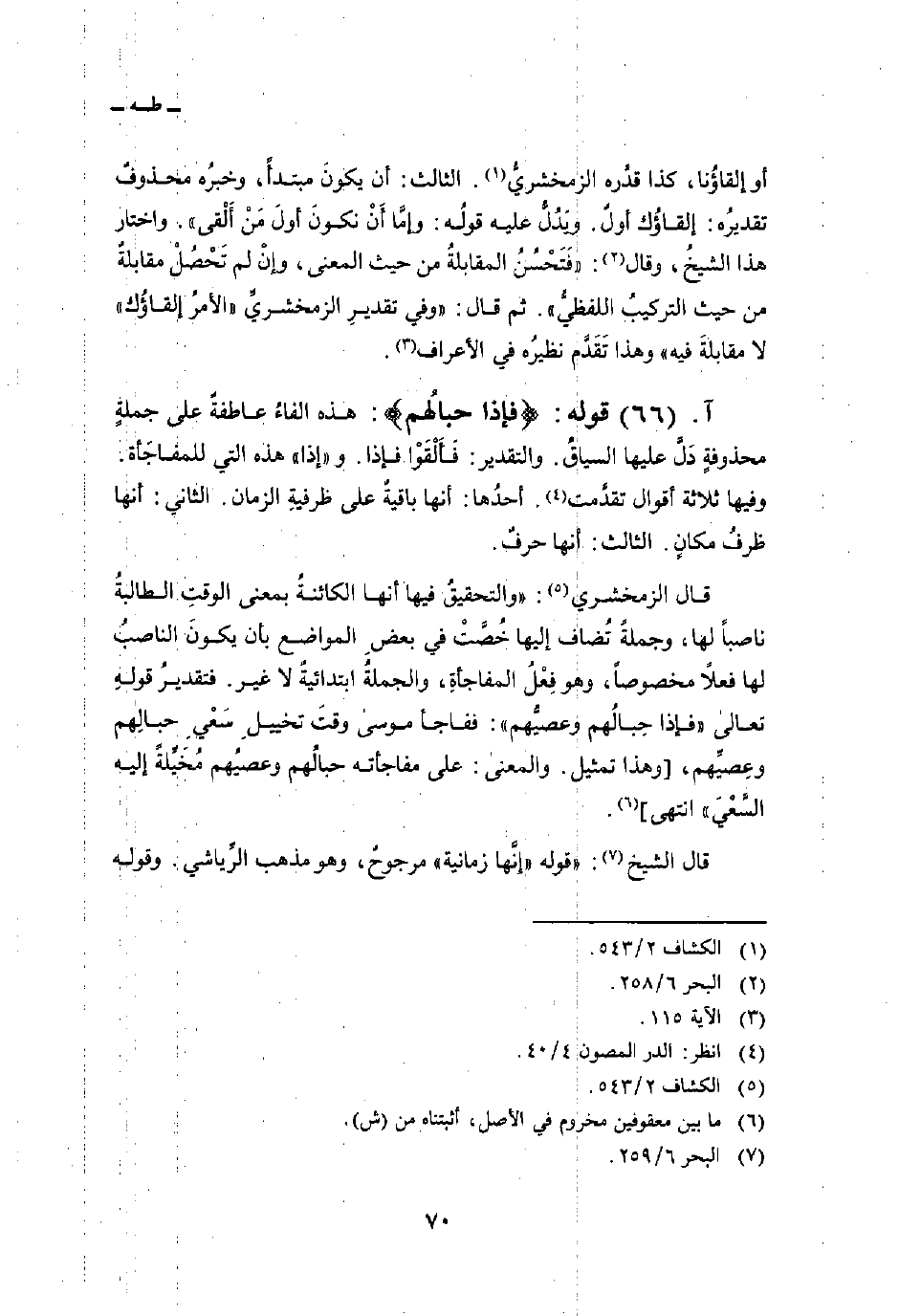 قال الزمخشري: «والتحقيق فيها أنها الكائنةُ بمعنى الوقتِ الطالبةُ ناصباً لها، وجملةً تُضاف إليها خُصَّتْ في بعضِ المواضع بأن يكونَ الناصبُ لها فعلاً مخصوصاً، وهو فِعْلُ المفاجأةِ، والجملةٌ ابتدائيةٌ لا غير. فتقديرُ قولِه تعالى {فَإِذَا حِبَالُهُمْ وَعِصِيُّهُمْ} : ففاجأ موسى وقتَ تخييلِ سَعْيِ حبالِهم وعِصيِّهم، [وهذا تمثيل. والمعنى: على مفاجأته حبالُهم وعصيُهم مُخَيِّلَةً إليه السَّعْيَ» انتهى] .
