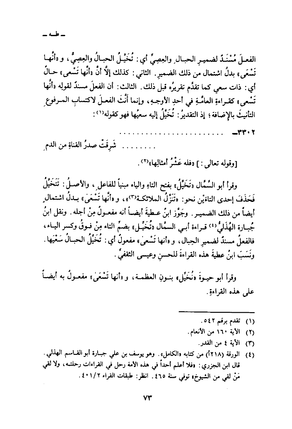 الفعلَ مُسْنَدٌ لضميرِ الحبالِ والعِصِيِّ أي: تُخَيَّلُ الحبالُ والعِصِيُّ، و «أنَّها تَسْعَى» بدلُ اشتمال من ذلك الضميرِ. الثاني: كذلك إلاَّ أنَّ «أنَّها تَسْعى» حالٌ أي: ذات سعي كما تقدَّم تقريرُه قبل ذلك. الثالث: أن الفعلَ مسندٌ لقولِه «أنَّها تَسْعى» كقراءةِ العامَّةِ في أحدِ الأوجهِ، وإنما أَنَّثَ الفعلَ لاكتسابِ المرفوعِ التأنيثَ بالإِضافة؛ إذا التقديرُ: تُخَيَّلُ إليه سعيُها فهو كقوله: