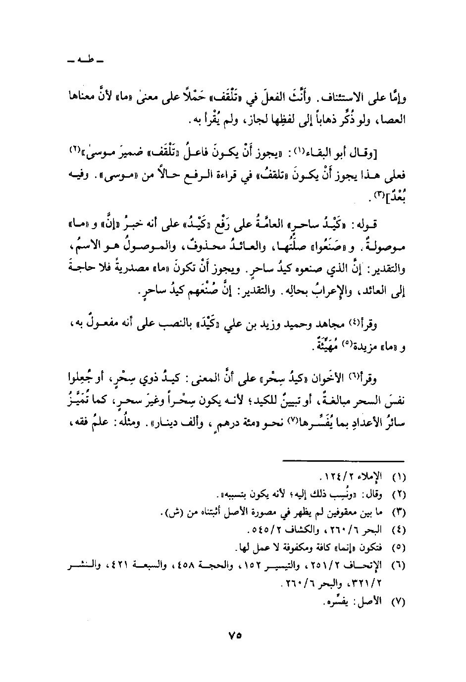 وقرأ الأخَوان «كيدُ سِحْر» على أنَّ المعنى: كيدُ ذوي سِحْرٍ، أو جُعِلوا نفسَ السحر مبالغةً، أو تبيينٌ للكيد؛ لأنه يكون سِحْراً وغيرَ سحرٍ، كما تُمَيَّزُ سائرُ الأعدادِ بما يُفَسِّرها نحو «مئة درهمٍ، وألف دينار» . ومثلُه: علمُ فقه،