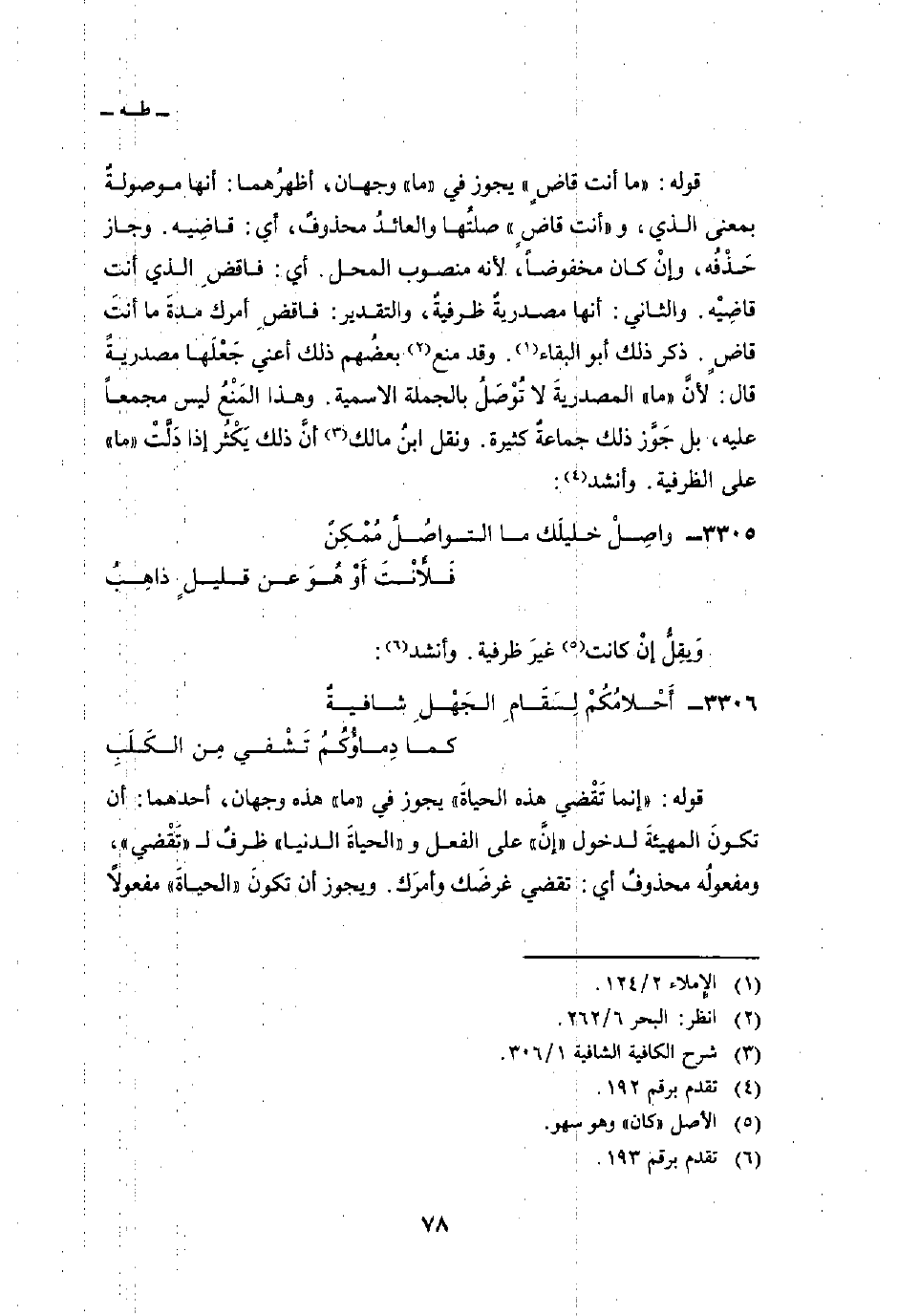 قوله: {مَآ أَنتَ قَاضٍ} يجوز في «ما» وجهان، أظهرُهما: أنها موصولةٌ بمعنى الذي، و «أنت قاضٍ» صلتُها والعائدُ محذوفٌ، اي: قاضِيه. وجاز حَذْفُه، وإنْ كان مخفوضاً، لأنه منصوب المحل. أي: فاقضِ الذي أنت قاضِيْه. والثاني: أنها مصدريةٌ ظرفيةٌ، والتقدير: فاقضِ أمرك مدةَ ما أنتَ قاضٍ. ذكر ذلك أبو البقاء. وقد منع بعضُهم ذلك أعني جَعْلَها مصدريةً قال: لأنَّ: «ما» المصدريةَ لا تُوْصَلُ بالجملة الاسمية. وهذا المَنْعُ ليس مجمعاً عليه، بل جَوَّز ذلك جماعةٌ كثيرة. ونقل ابنُ مالك أنَّ ذلك يَكْثُر إذا دَلَّتْ «ما» على الظرفية. وأنشد: