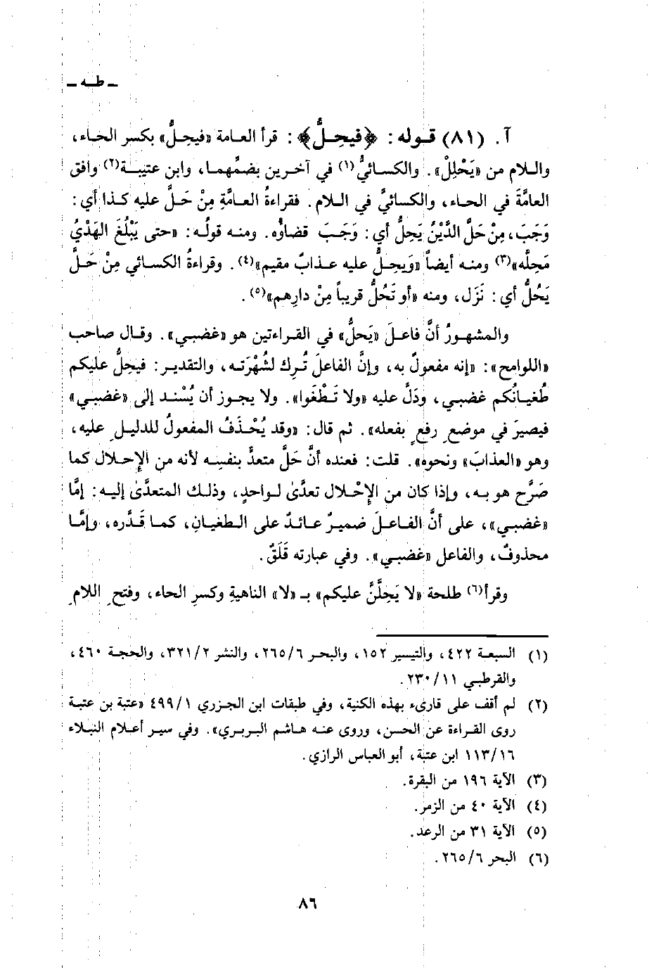 والمشهورُ أنَّ فاعلَ «يَحلُّ» في القراءتين هو «غضبي» . وقال صاحب «اللوامح» : «إنه مفعولٌ به، وإنَّ الفاعلَ تُرِك لشُهْرَته، والتقدير: فيحِلُّ عليكم طُغْيانُكم غضبي، ودَلَّ عليه» ولا تَطْغَوا «. ولا يجوز أن يُسْند إلى» غضبي «فيصيرَ في موضعِ رفعٍ بفعله» . ثم قال: «وقد يُحْذَفُ المفعولُ للدليلِ عليه، وهو» العذابَ «ونحوه» . قلت: فعنده أنَّ حَلَّ متعدٍّ بنفسِه لأنه من الإِحلال كما صَرَّح هو به. وإذا كان من الإِحْلال تعدى لواحدٍ، وذلك المتعدى إليه: إمَّا «غضبي» ، على أنَّ الفاعلَ ضميرٌ عائدٌ على الطغيانِ، كما قَدَّره، وإمَّا محذوفٌ، والفاعل «غضبي» . وفي عبارته قَلَقٌ.