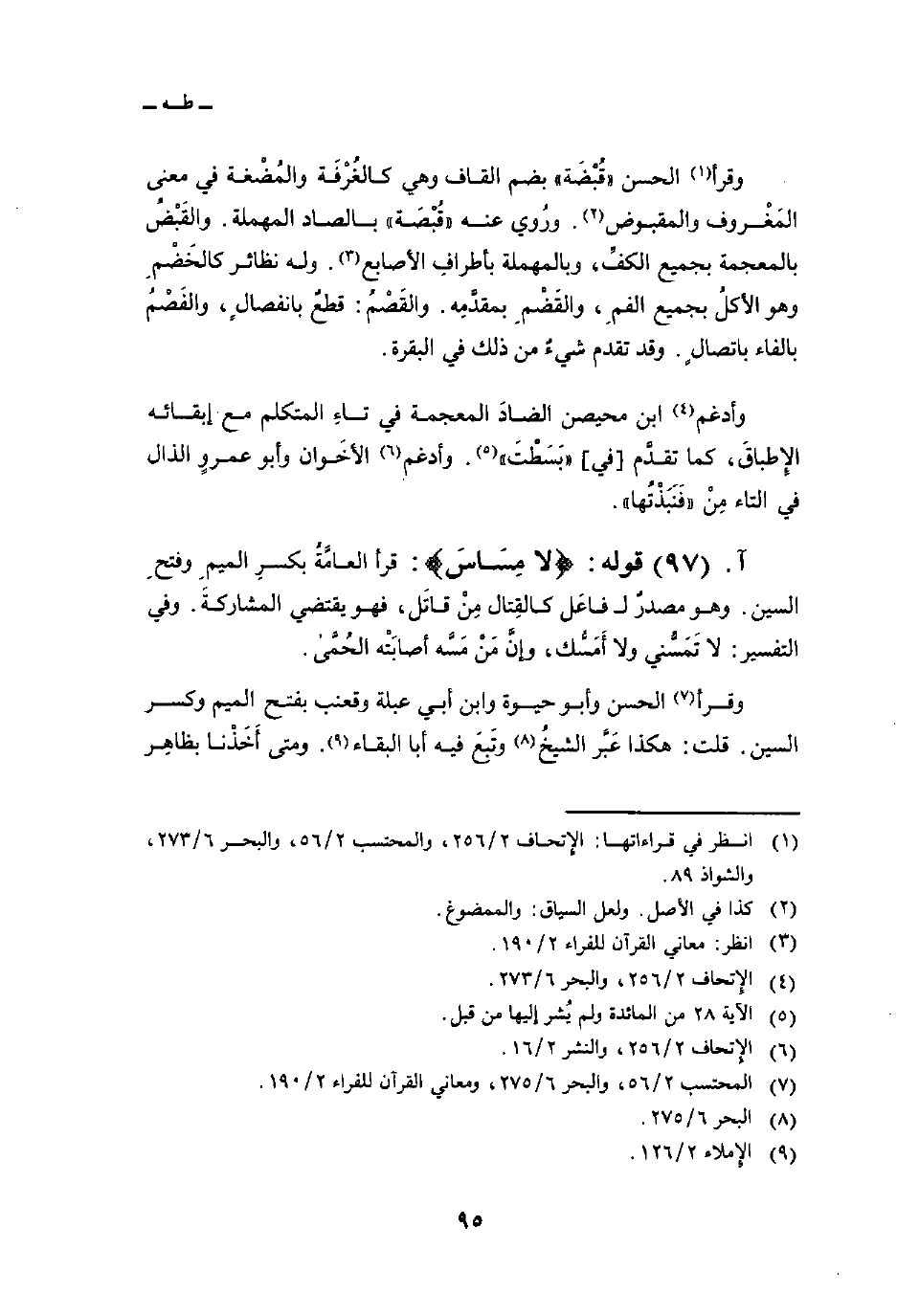 وقرأ الحسن» قُبْضَة «بضم القاف وهي كالغُرْفَة والمُضْغة في معنى المَغْروف والمقبوض. ورُوي عنه» قُبْصَة «بالصاد المهملة. والقَبْضُ بالمعجمة بجميع الكفِّ، وبالمهملة بأطرافِ الأصابع. وله نظائر كالخَضْمِ وهو الأكلُ بجميع الفمِ، والقَضْمِ بمقدَّمِه. والقَصْمُ: قطعٌ بانفصالٍ، والفَصْمُ بالفاء باتصالٍ. وقد تقدم شيءٌ من ذلك في البقرة.