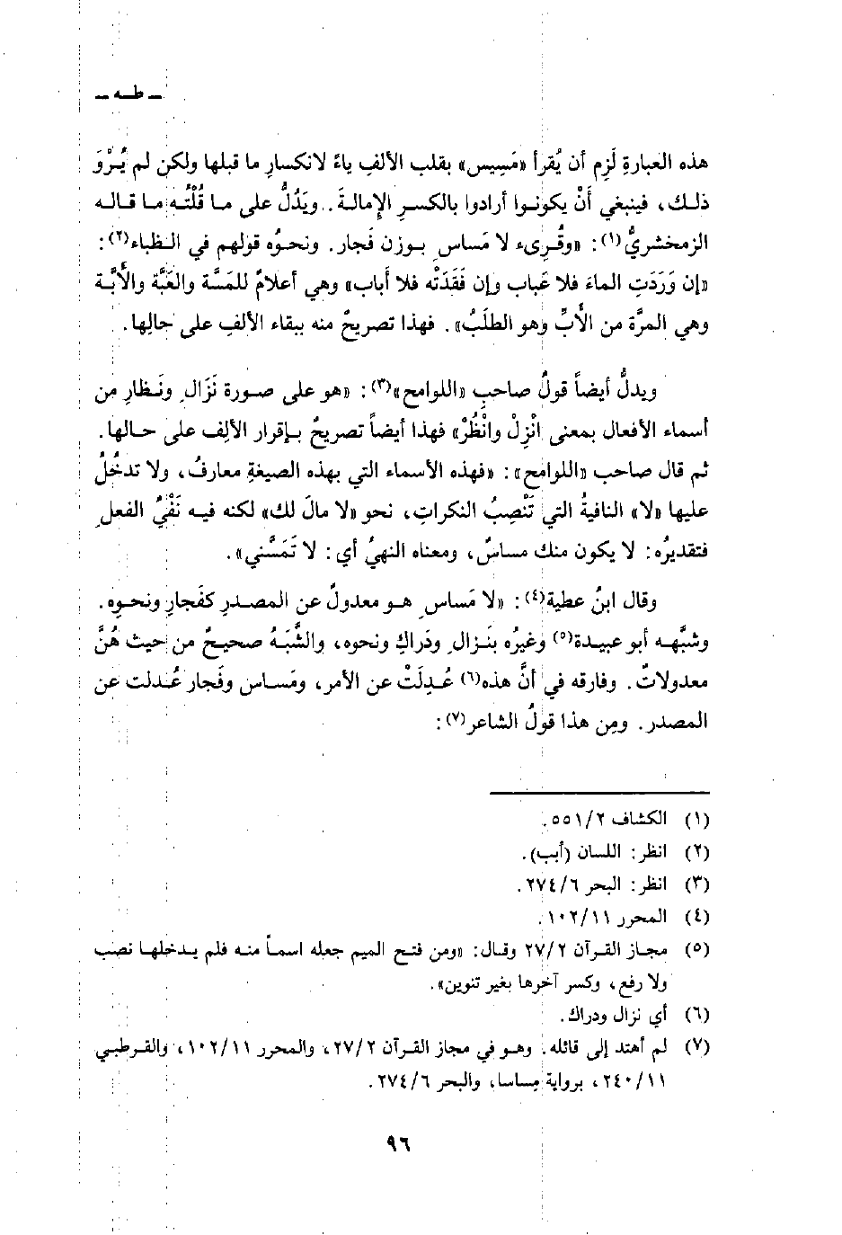 هذه العبارة لَزِم أن يُقرأ «مَسِيس» بقلب الألفِ ياءً لانكسارِ ما قبلها ولكن لم يُرْوَ ذلك، فينبغي أَنْ يكونوا أرادوا بالكسرِ الإِمالةَ. ويَدُلُّ على ما قُلْتُه ما قاله الزمخشريُّ: «وقُرِىء لا مَساسِ بوزن فَجار. ونحوُه قولهم في الظباء:» إن وَرَدَتِ الماءَ فلا عَباب وإن فَقَدَتْه فلا أَباب «وهي أعلامٌ للمَسَّة والعَبَّة والأَبَّة وهي المرَّة من الأَبِّ وهو الطلَبُ» . فهذا تصريحٌ منه ببقاء الألفِ على حالِها.