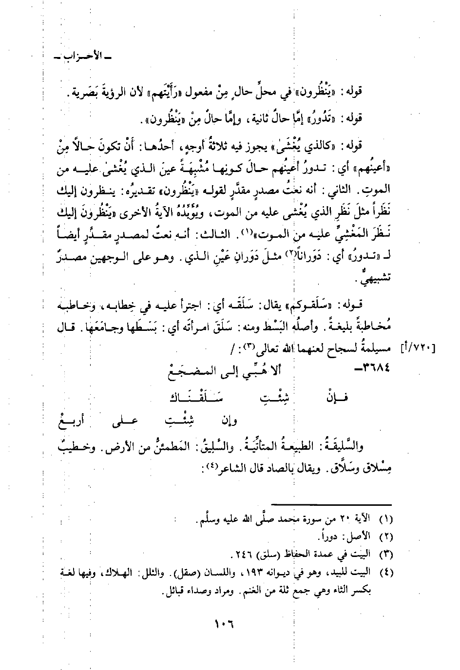 قوله: «كالذي يُغْشَى» يجوز فيه ثلاثةُ أوجهٍ، أحدُها: أَنْ تكونَ حالاً مِنْ «أعينُهم» أي: تدورُ أعينُهم حالَ كونِها مُشْبِهَةً عينَ الذي يُغْشى عليه من الموتِ. الثاني: أنه نعتُ مصدرٍ مقدَّرٍ لقوله «يَنْظُرون» تقديرُه: ينظرون إليك نَظَراً مثلَ نَظَرِ الذي يُغْشى عليه من الموت، ويُؤَيَّدُهُ الآيةُ الأخرى «يَنْظُرون إليك نَظَرَ المَغْشِيِّ عليه من الموت» . الثالث: أنه نعتٌ لمصدرٍ مقدَّرٍ أيضاً ل «تدورُ» أي: دَوَراناً مثلَ دَوَرانِ عَيْنِ الذي. وهو على الوجهين مصدرٌ تشبيهيٌّ.