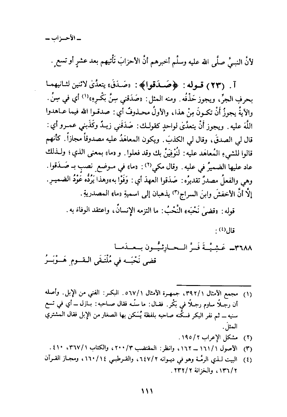 قوله: {صَدَقُواْ} : «صَدَقَ» يتعدَّى لاثنين لثانيهما بحرفِ الجرِّ، ويجوز حَذْفُه. ومنه المثل: «صَدَقني سِنَّ بَكْرِهِ» أي في سِنِّ. والآيةُ يجوزُ أَنْ تكونَ مِنْ هذا، والأولُ محذوفٌ أي: صدقوا الله فيما عاهدوا اللَّهَ عليه. ويجوز أَنْ يتعدَّى لواحدٍ كقولك: صَدَقني زيدٌ وكَذَبني عمرو أي: قال لي الصدقَ، وقال لي الكذبَ. ويكون المعاهَدُ عليه مصدوقاً مجازاً. كأنهم قالوا للشيءِ المُعاهَد عليه: لنُوفِيَنَّ بك وقد فعلوا. و «ما» بمعنى الذي؛ ولذلك عاد عليها الضميرُ في عليه. وقال مكي: «ما» في موضعِ نصبٍ ب صَدَقوا. وهي والفعلُ مصدرٌ تقديرُه: صَدَقوا العهدَ أي: وَفَوْا به «وهذا يَرُدُّه عَوْدُ الضميرِ. إلاَّ أنَّ الأخفشَ وابنَ السراج يذهبان إلى اسميةِ» ما «المصدريةِ.