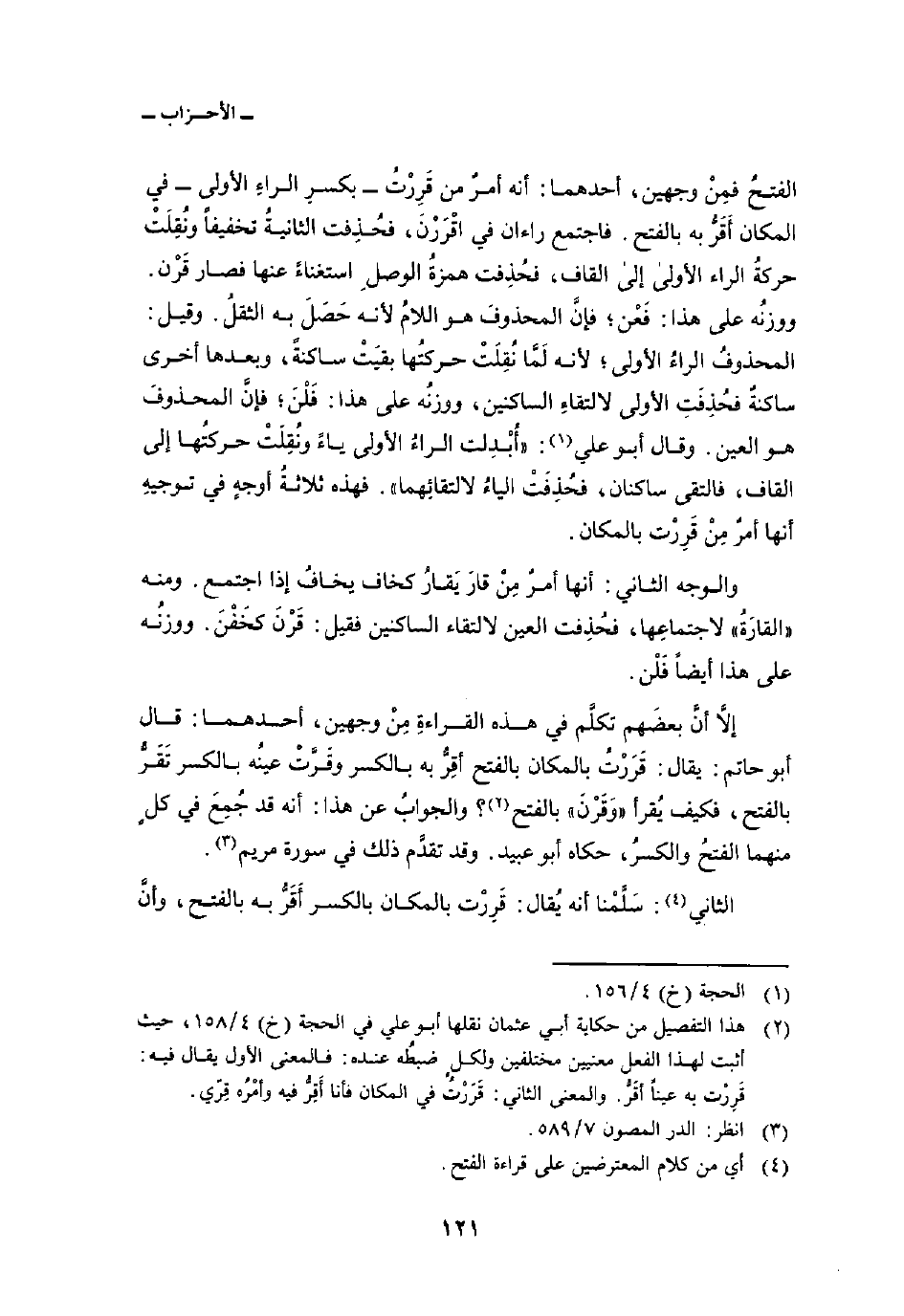 إلاَّ أنَّ بعضَهم تكلَّم في هذه القراءةِ مِنْ وجهين، أحدهما: قال أبو حاتم: يقال: قَرَرْتُ بالمكان بالفتح أقِرُّ به بالكسر وقَرَّتْ عينُه بالكسر تَقَرُّ بالفتح، فكيف يُقرأ «وَقَرْنَ» بالفتح؟ والجوابُ عن هذا: أنه قد جُمِعَ في كلٍ منهما الفتحُ والكسرُ، حكاه أبو عبيد. وقد تقدَّم ذلك في سورة مريم.